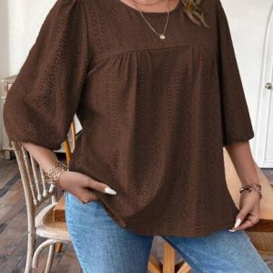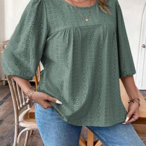 Camiseta casual de mujer de talla regular y talla grande con cuello redondo, manga farol gargantillada y estampado jacquard para verano