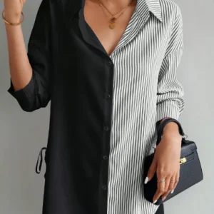 K0021 – Blusa casual de mujer con bloques de color y rayas, bajo asimétrico, camisa de mujer para primavera/otoñ