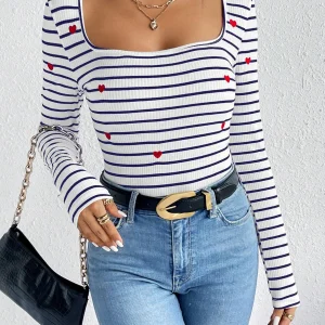 ST279 – Camiseta Entallada Con Cuello Cuadrado De Tela De Textura De Cuerpo, Estampado De Rayas Y Bordado De Corazón
