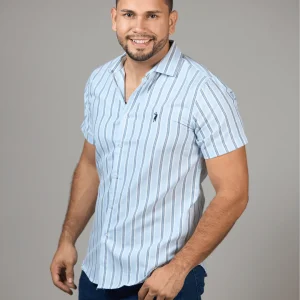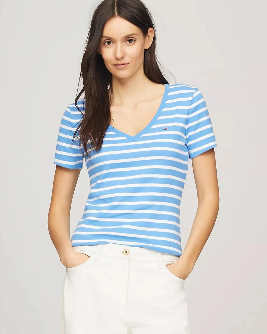 CAMISETA TOMMY HILFIGER CUELLO V DE RAYAS CELESTES CON BLANCO DE DAMA, 100% ALGODÓN