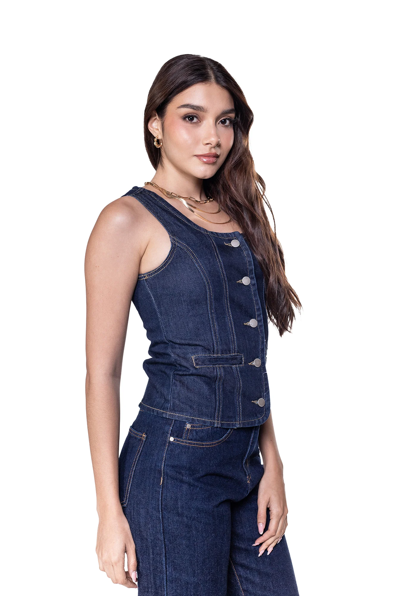 Nuestra Horma es SLIM FIT (Silueta pequeña), Chaleco dama en denim, con botones.