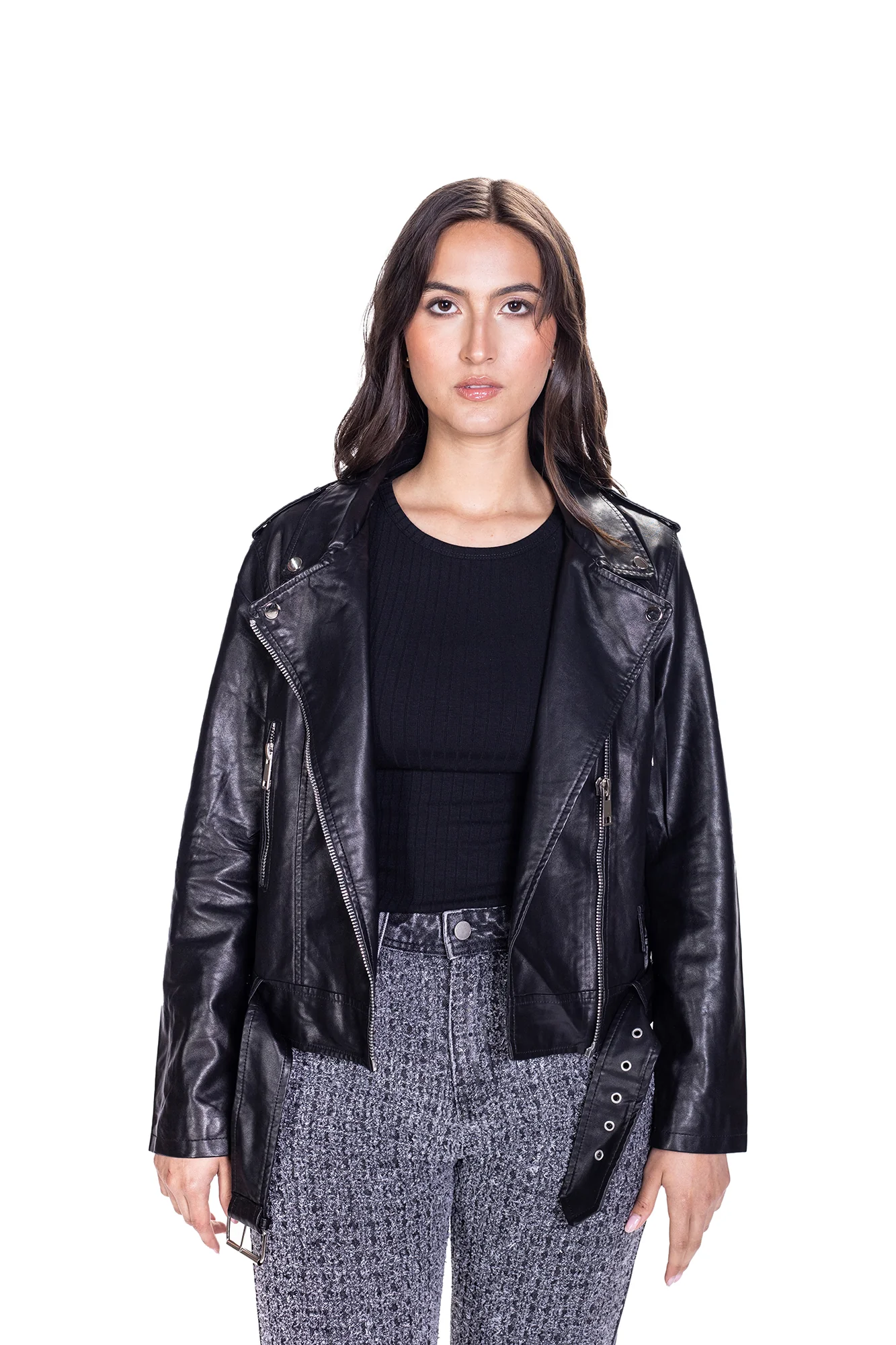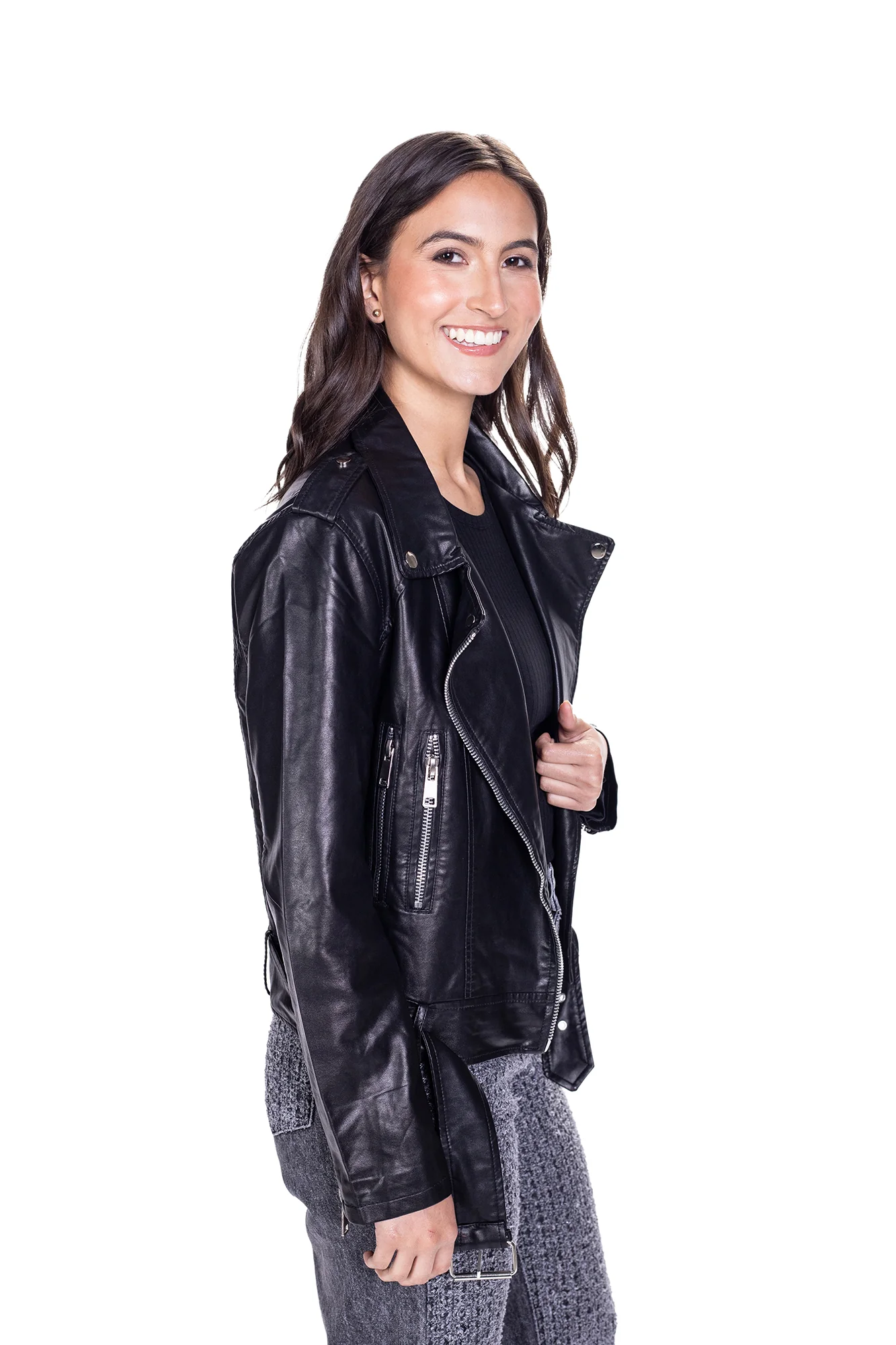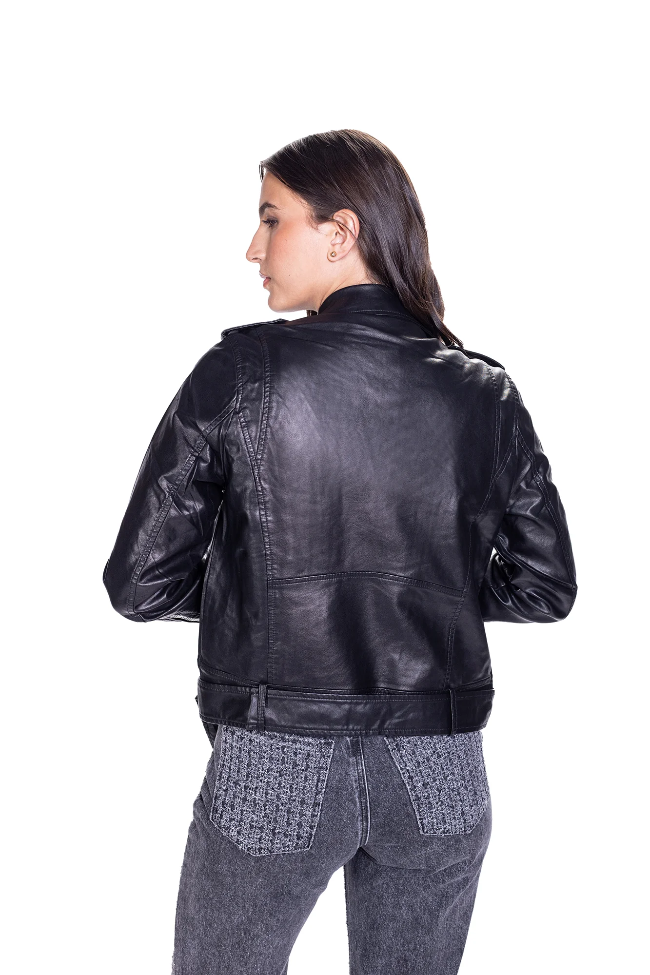 Chaqueta efecto piel, silueta SEMI AJUSTADA, con cierre de cremallera y bolsillos laterales. Tela rígida.