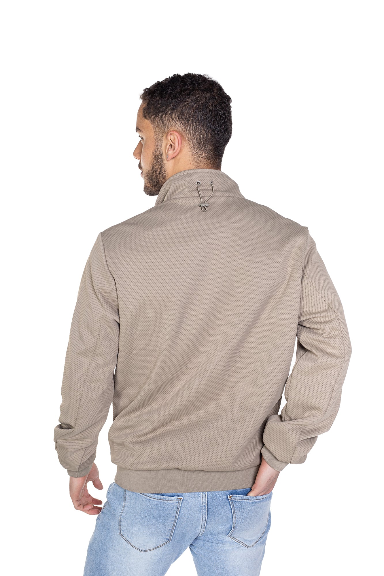 Chaqueta silueta SEMI AJUSTADA, con cierre de cremallera y bolsillos laterales. Tela rígida.