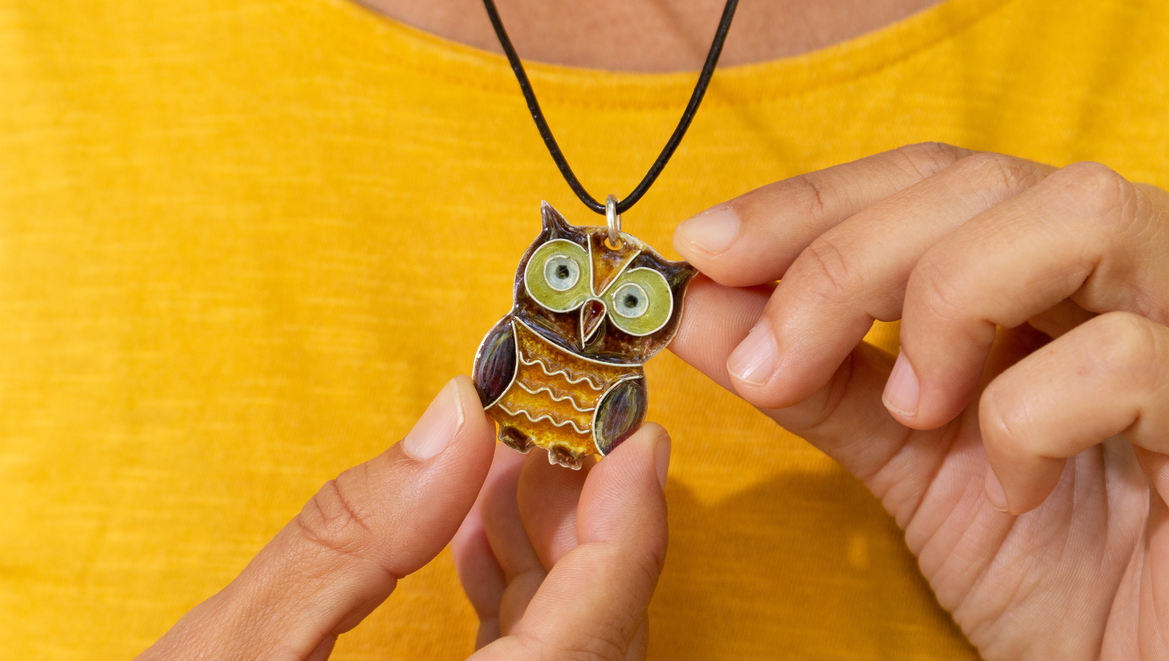 Esta pieza artesanal está hecha a mano de principio a fin: he recortado la forma del búho sobre una base de plata fina (sin aleación) y la he esmaltado con diferentes capas de esmalte. Cada capa de esmalte se hornea a 900ºC. Los últimos detalles están hechos con esmalte vitrificable, horneado a 650ºC.