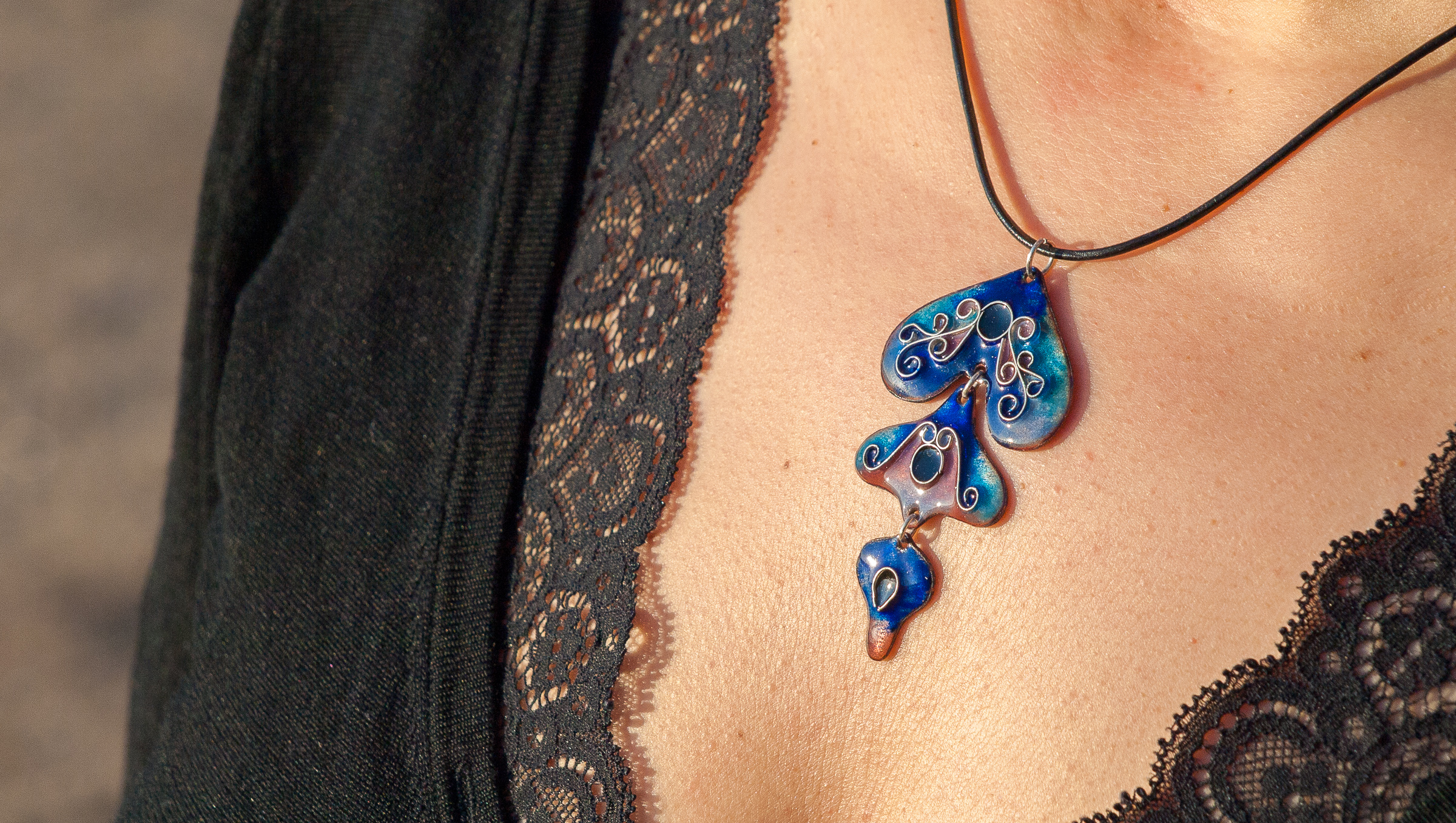 Esta pieza está realizada a mano, con base de cobre que ha sido esmaltada en horno a 900ºC con esmaltes transparentes en tonos azulados y violetas. La decoración está está hecha con hilo plano de plata de ley, «soldada» al esmalte utilizando la técnica del cloisonné.