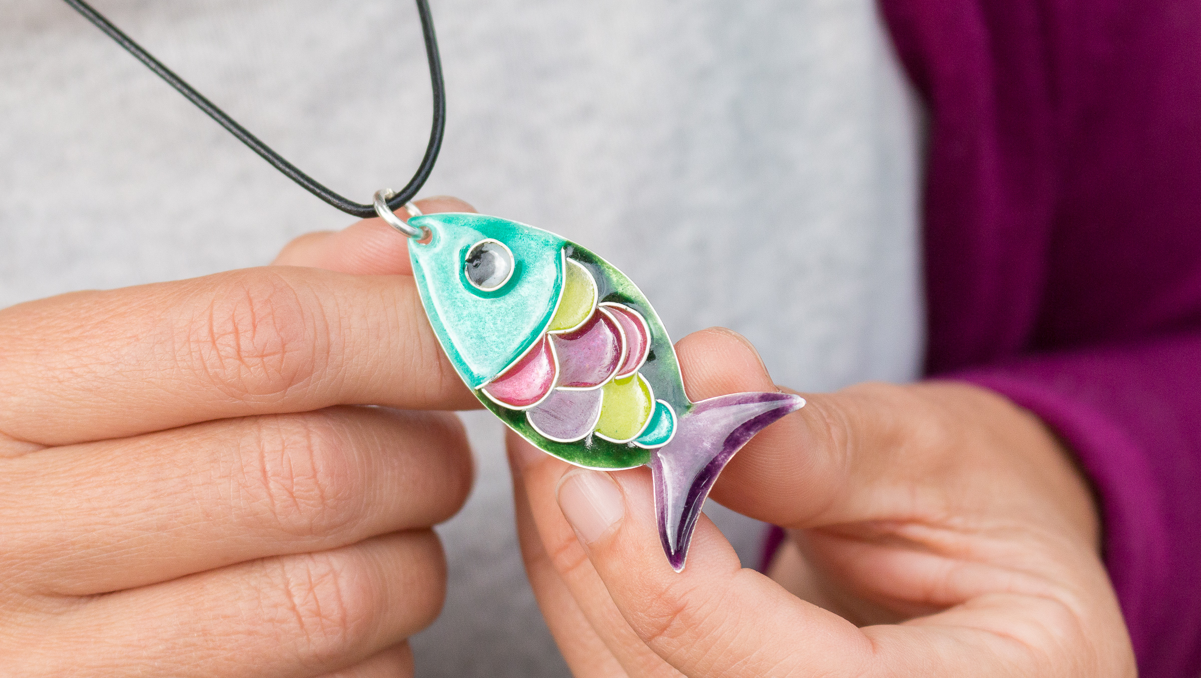 Esta pieza artesanal está hecha con mucho cariño, realizada a mano de principio a fin: he recortado la plata, la he esmaltado con varias capas de esmaltes transparentes para conseguir esos colores tan únicos. Las escamas están hecha con hilo de plata plano, con una técnica que me gusta especialmente y que se llama «tabicado«, y que consiste en sujetar el hilo de plata a la pieza sin soldadura, directamente con el esmalte. ¡Es una pieza que no pasará desapercibida!