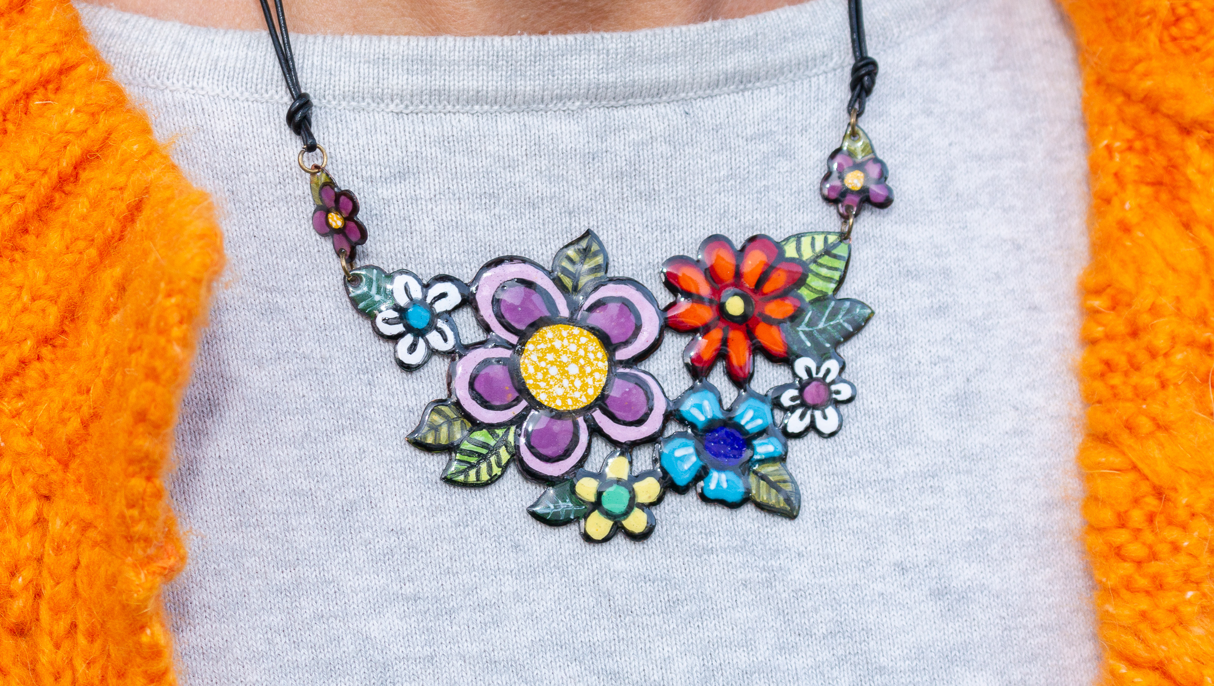 Cuando hice esta pieza tenía claro que quería divertirme haciéndola y que el resultado fuera una explosión de alegría. Todas mis ideas parten de un boceto en papel, que voy modificando pensando en cómo lo puedo transformar en esmalte. Tenía ganas de hacer una pieza llena de flores inspirada por esos estampados de flores setenteros que tanto me gustan. Una vez que definí el dibujo, lo pegué sobre una chapa de cobre y los segueté, por dentro y por fuera, porque quería que la pieza tuviera huecos entre las flores.
