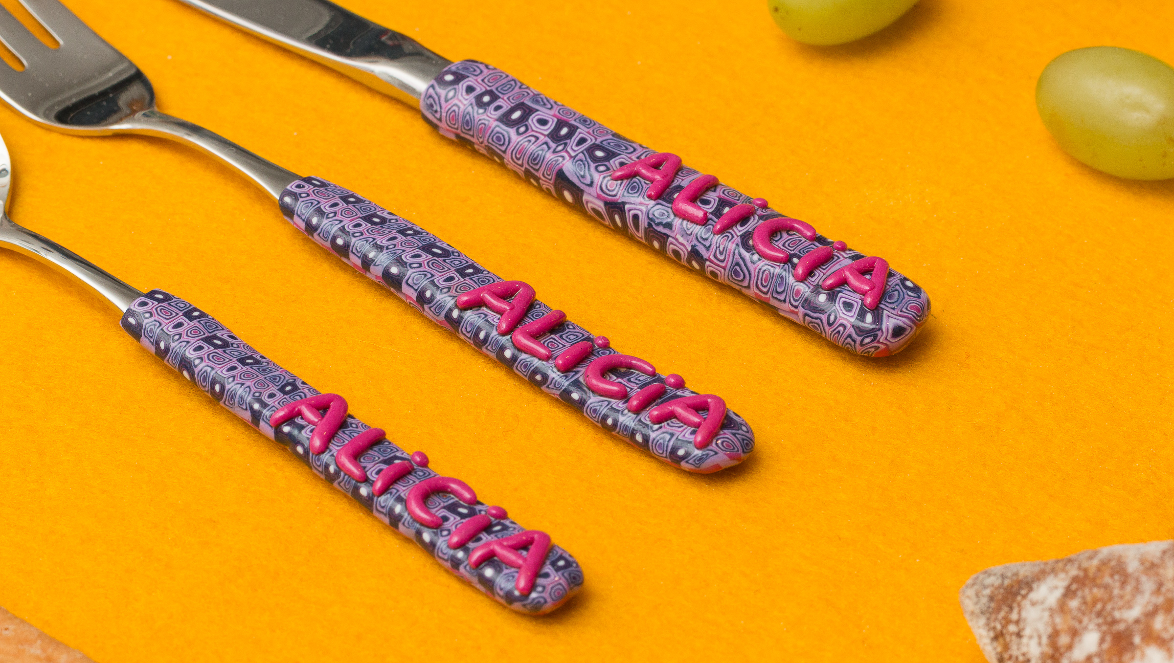 Juego de cubiertos infantil de acero inoxidable, con el mango recubierto de fimo (resina polimérica), y personalizado con el nombre de la niña o el niño.