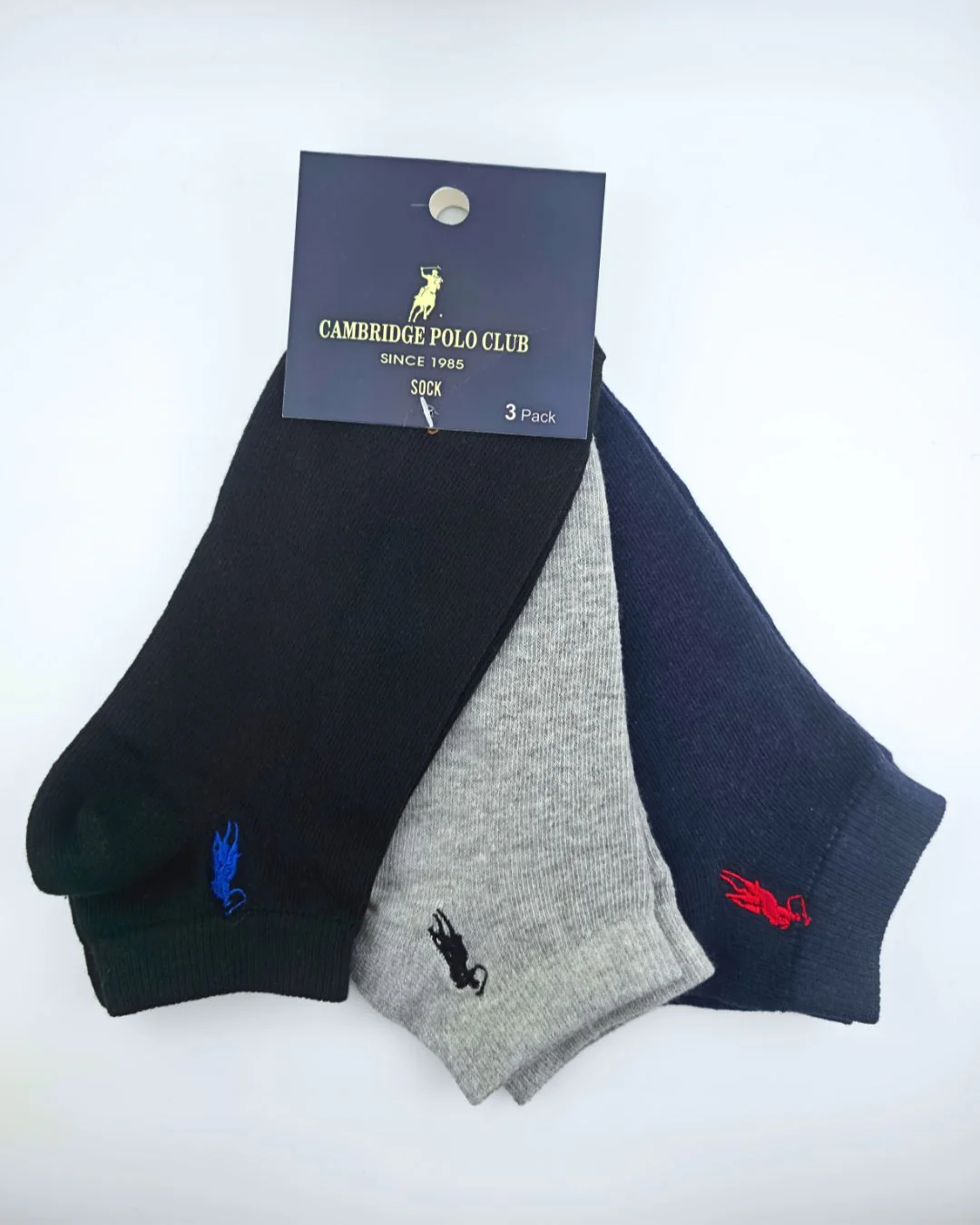 MEDIAS CAMBRIDGE POLO 3 PACK NEGRO – AZUL – GRIS, 80% ALGODÓN, 18% POLIÉSTER, 2% ELASTANO PARA CABALLERO