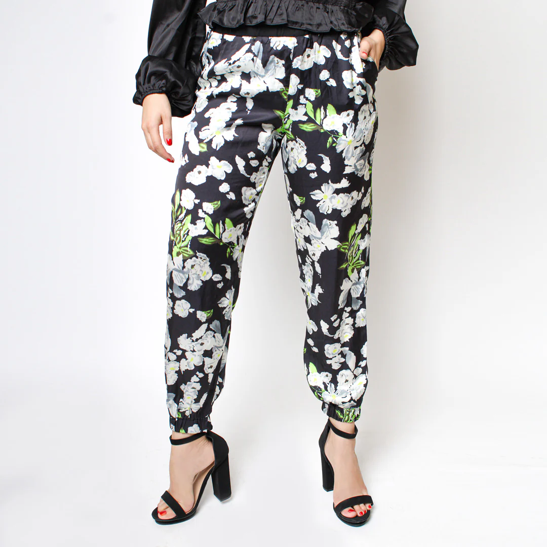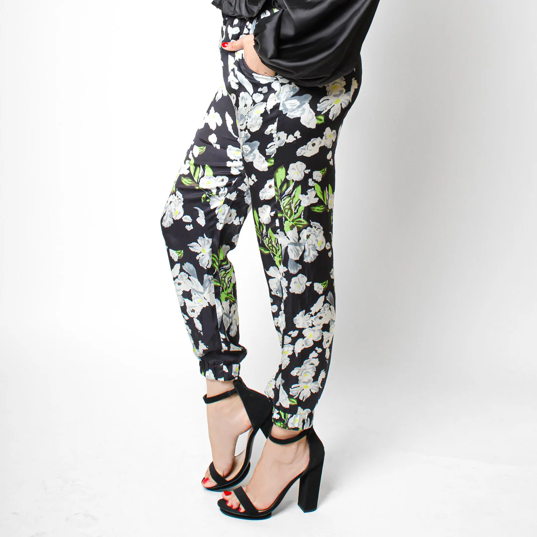 -Confeccionado en tela satinada estampada con bolsillos en laterales, corte holgado.