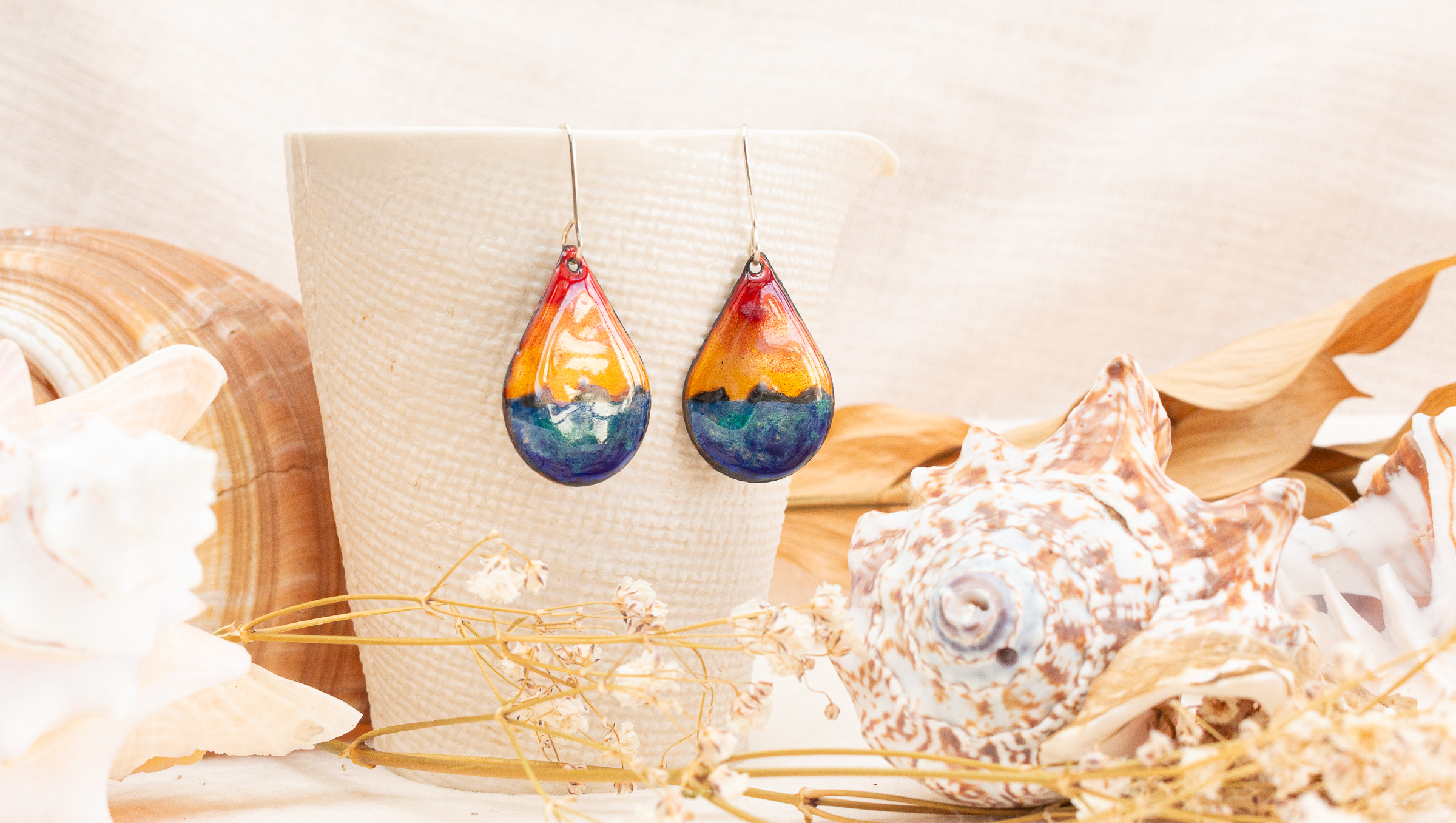 Estos pendientes son un pequeño homenaje a esta vista. Están hechos con esmaltes a fuego transparentes sobre base de cobre, y horneados a 900º con sucesivas capas de esmalte para ir consiguiendo todas las tonalidades. Los que vivimos o hemos vivido en Santiago de Compostela aprendemos a convivir y a apreciar la lluvia en nuestros día a día, y no deja de ser fuente de inspiración constante en la creación de piezas, como es el caso de esta pieza artesanal.