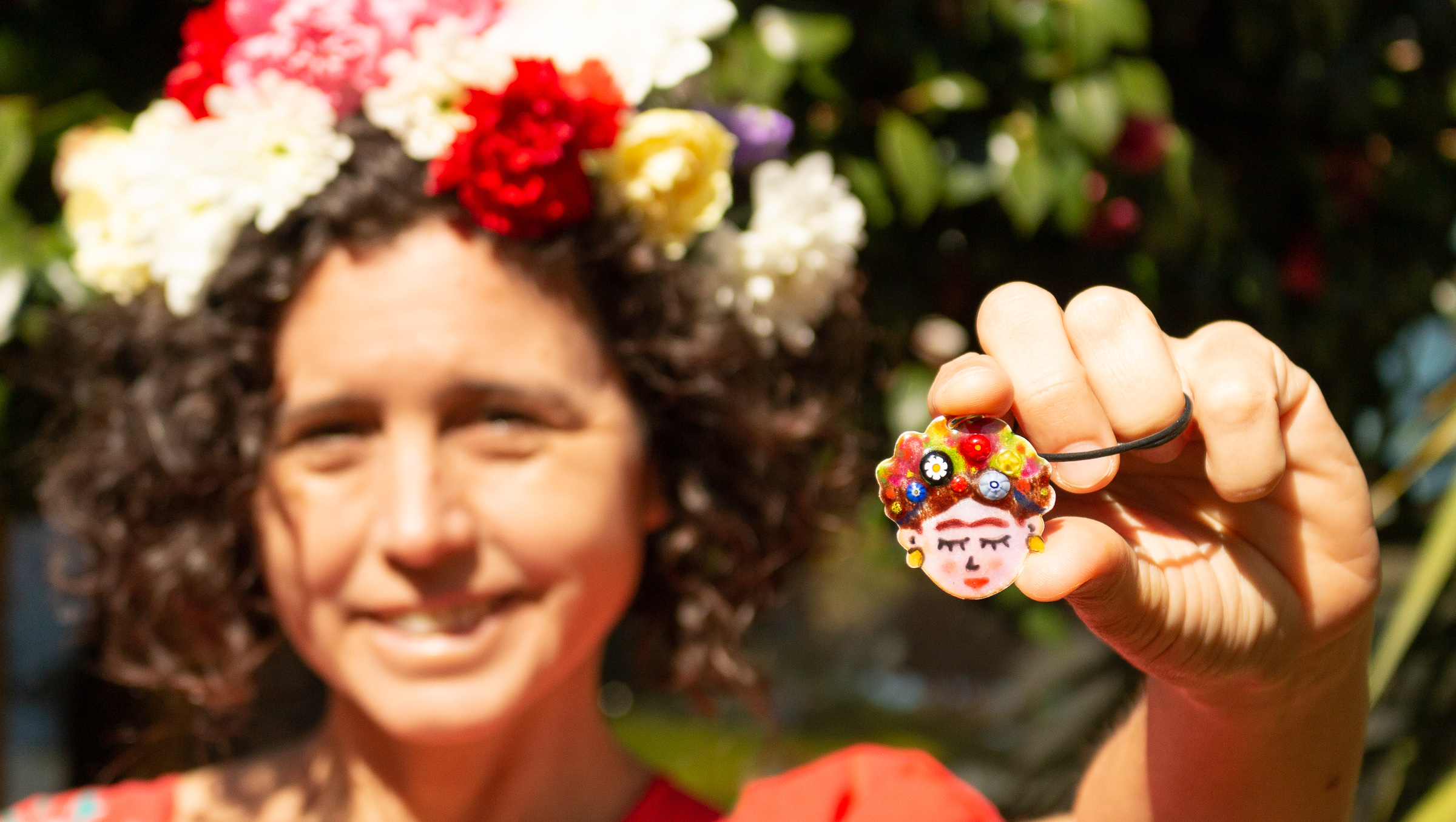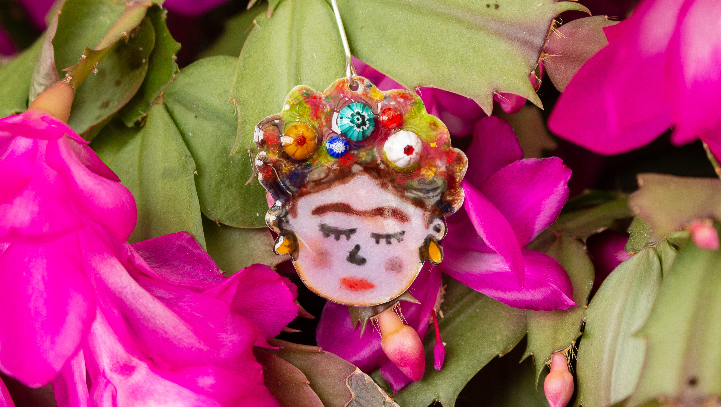 He disfrutado muchísimo haciendo estas piezas en esmalte, ya que los esmaltes a fuego tienen los colores y el brillo perfecto para poder representar las flores del pelo de Frida. Además, con las cuentas millefiori que he fundido sobre el esmalte, el tocado floral cobra aún más vida.