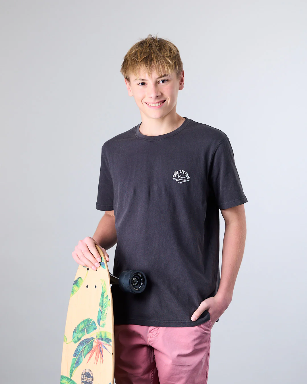 Polera manga corta Junior confeccionada con 100% algodón en tela procesada. Cuello redondo clásico y calce Modern Fit la convierten en una elección ideal tanto para la ciudad como para una salida casual. El calce Modern Fit es un corte más holgado, con una silueta suelta y relajada, pero no oversize.