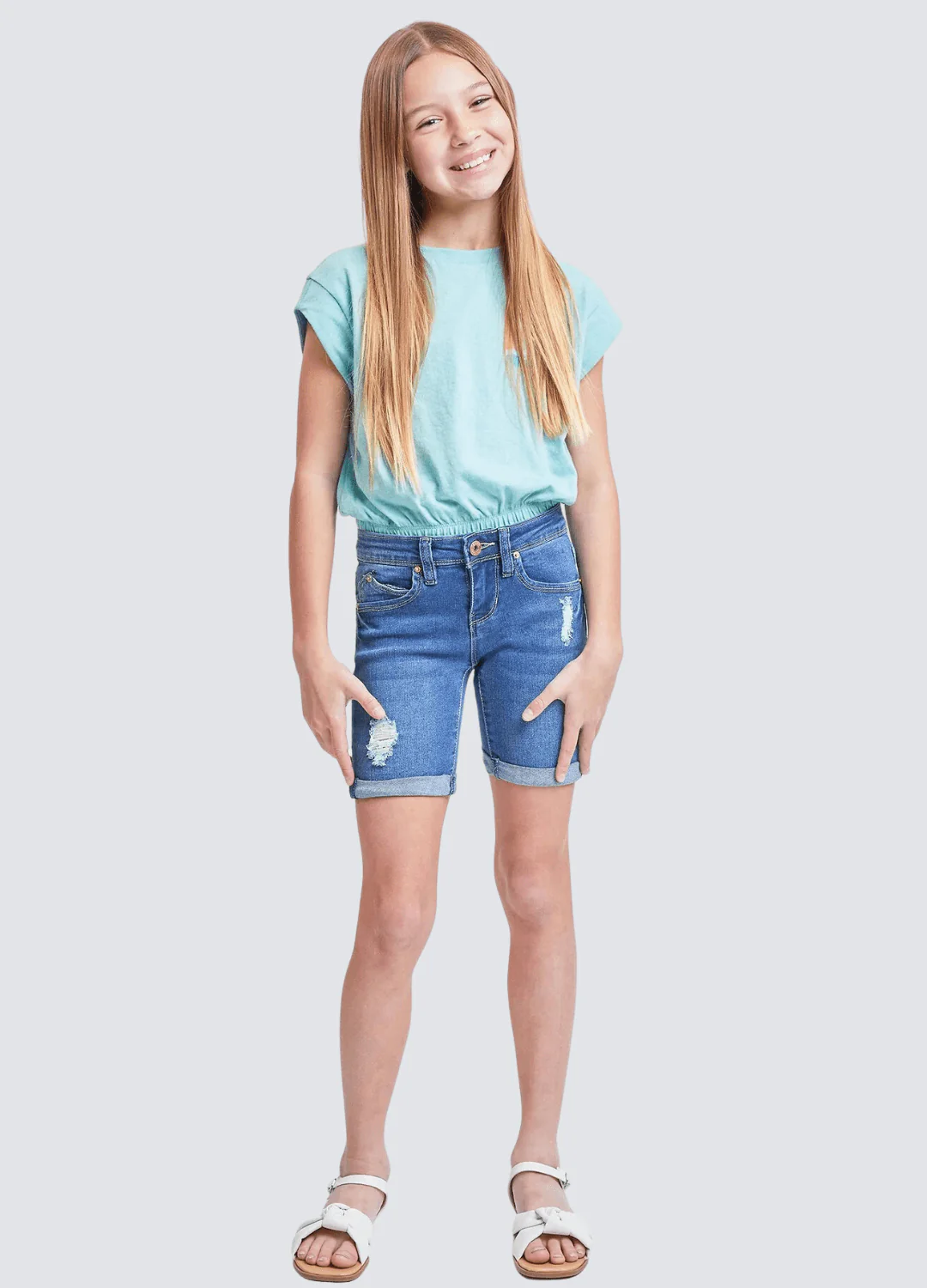 SHORT YMI AZUL ROTO MEZCLILLA PARA NIÑA, 74% ALGODÓN, 21% POLIESTER, 3% VISCOSA, 2% ELASTANO