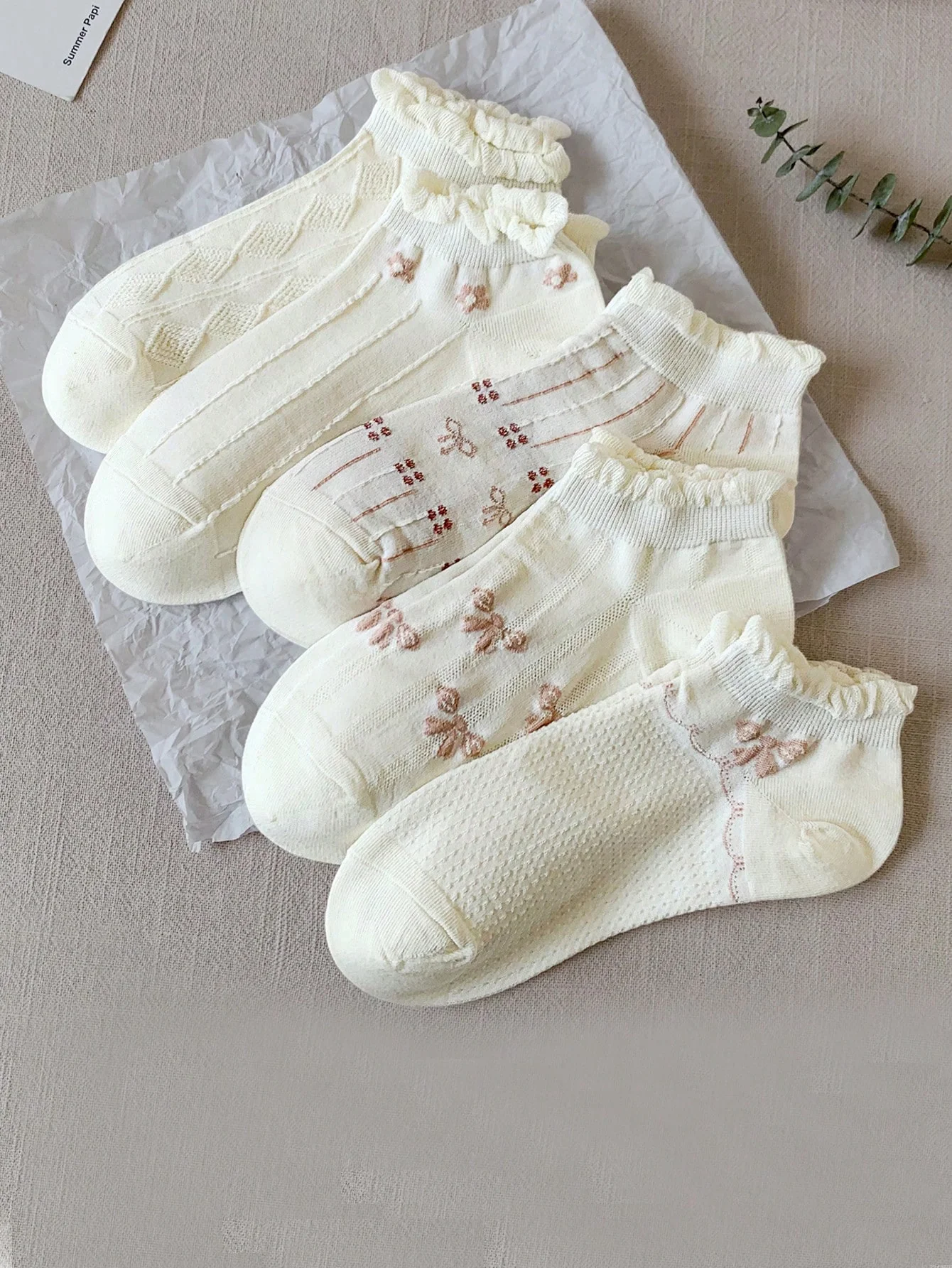 ST111 – Paquete Aleatorio De 5 Pares Calcetines Blancos Para Niñas Con Boca De Burbuja Y Detalle Floral En 3d, Bonitos Y Cómodos, Adecuados Para Primavera Y Verano