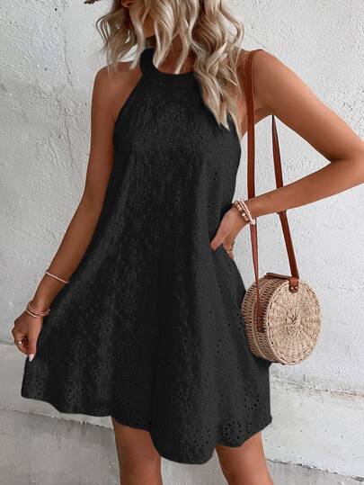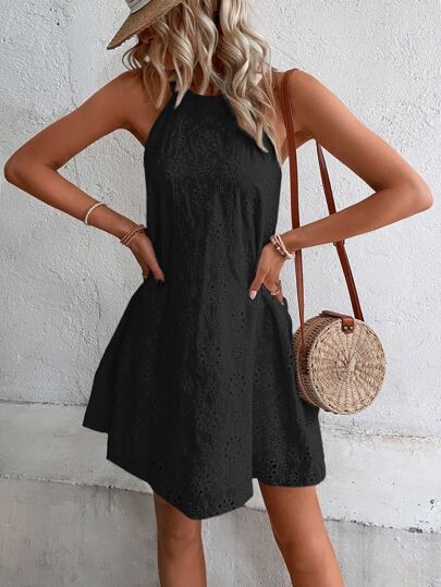 ST1158 – Vestido unicolor con bordado con ojal de cuello halter de espalda con abertura de ojo
