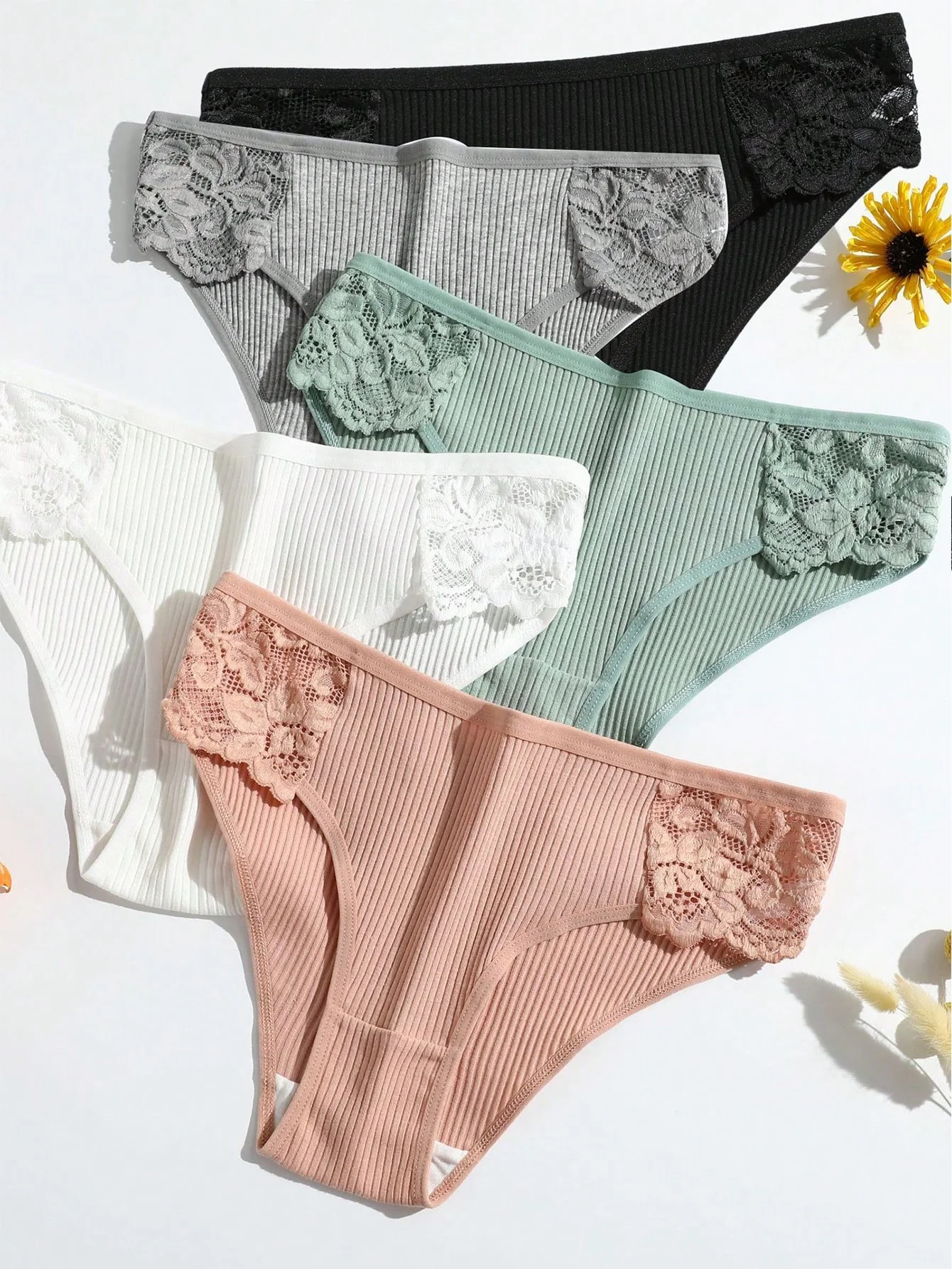 ST452 5 piezas/paquete de nuevas bragas triangulares con hilo para mujer, ropa interior de encaje de cintura baja, unicolor y transpirable con refuerzo doble