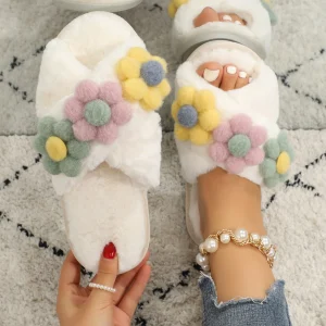 M523 – Zapatillas de peluche con diseño de flor con tira cruzada de peluche