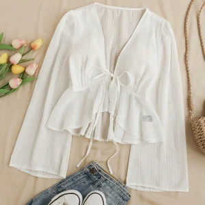 M7019 – Blusa con escote en V, cintura ajustable con lazo, mangas acampanadas y fruncido en el dobladillo con detalle de volantes