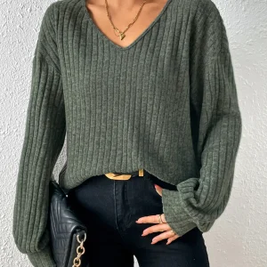 ST1205 – Frenchy Camiseta Tejida De Cuello En V Verde Con Costilla De Hombro Caído