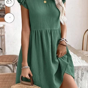 M1719 – Vestido de cuello en V de manga corta con volantes y de color sólido para mujer, 100% algodón transpirable y cómodo, vestido verde, vestido de muñeca con mangas acampanadas y botones frontales, vestidos casual de verano