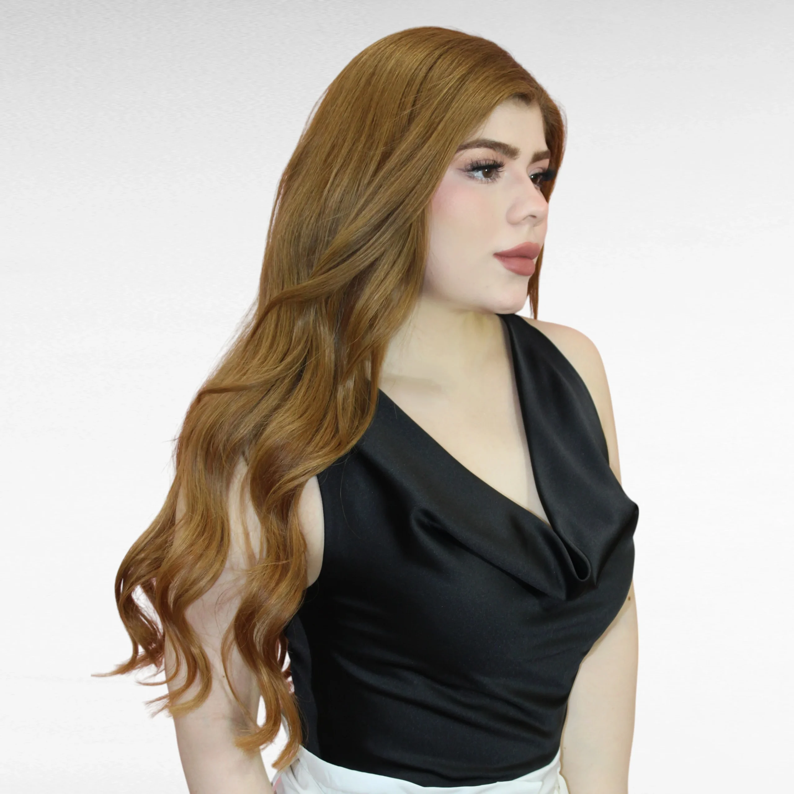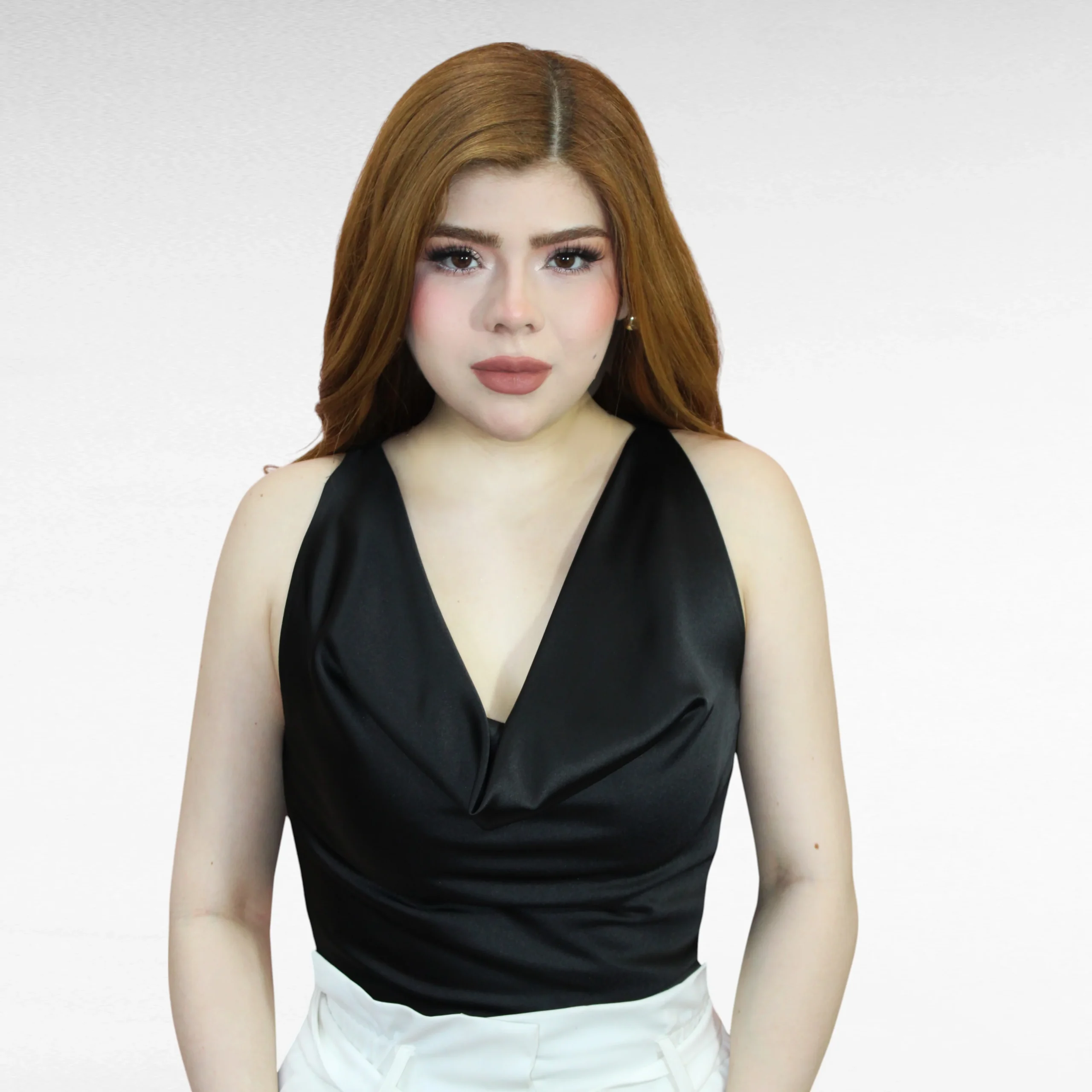 Esta cautivadora blusa de satinado en un elegante tono negro es la elección perfecta para agregar un toque de sofisticación a tu guardarropa.