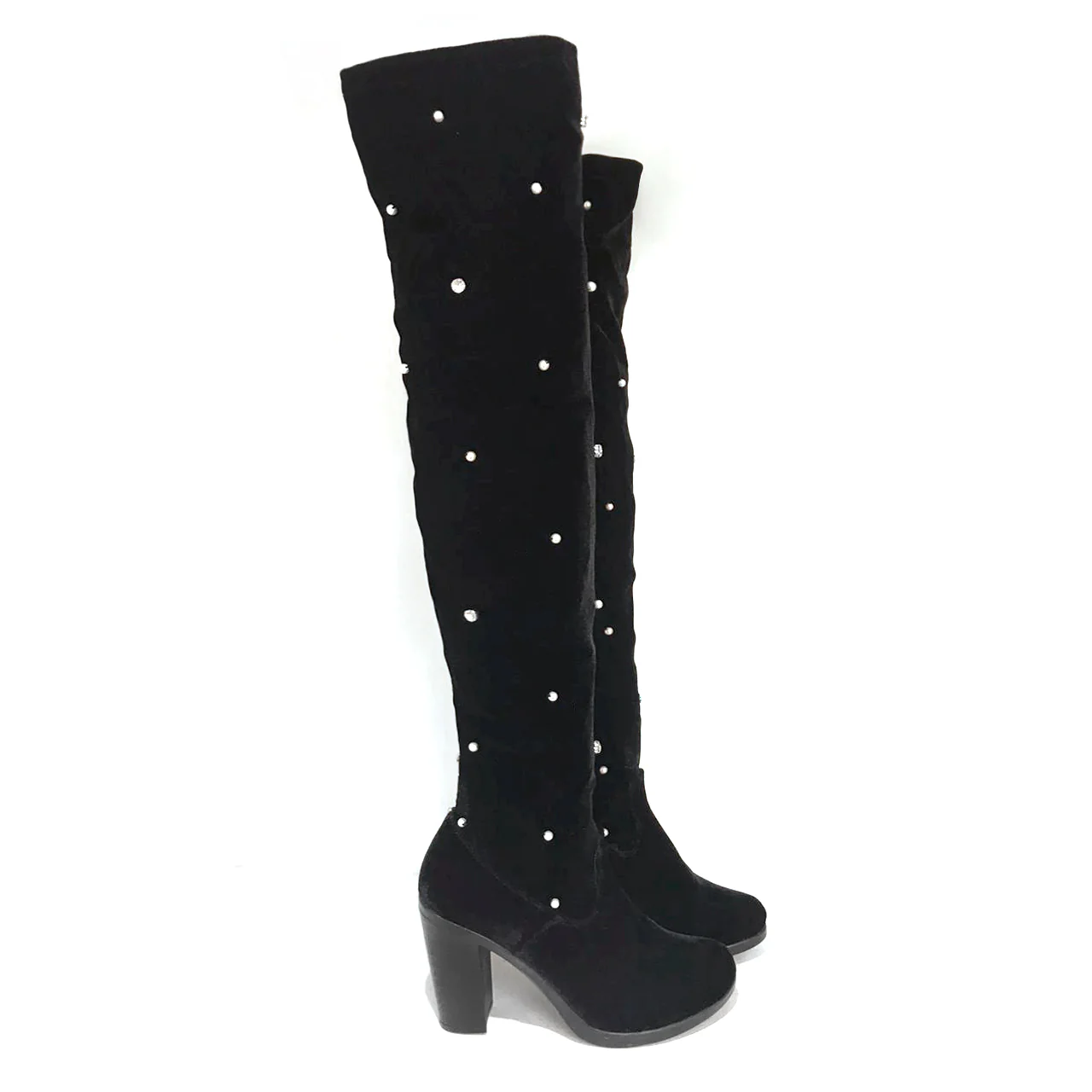 -MATERIAL EXTERIOR: Gamuza con aplicaciones en pedrería y perlas sintéticas.