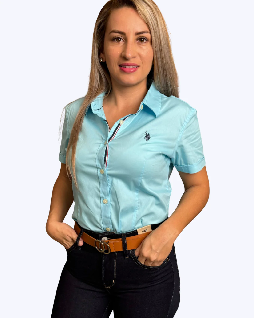 CAMISA U.S POLO ASSN CELESTE PARA DAMA MANGA CORTA 97%ALGODÓN 3%ELASTANO