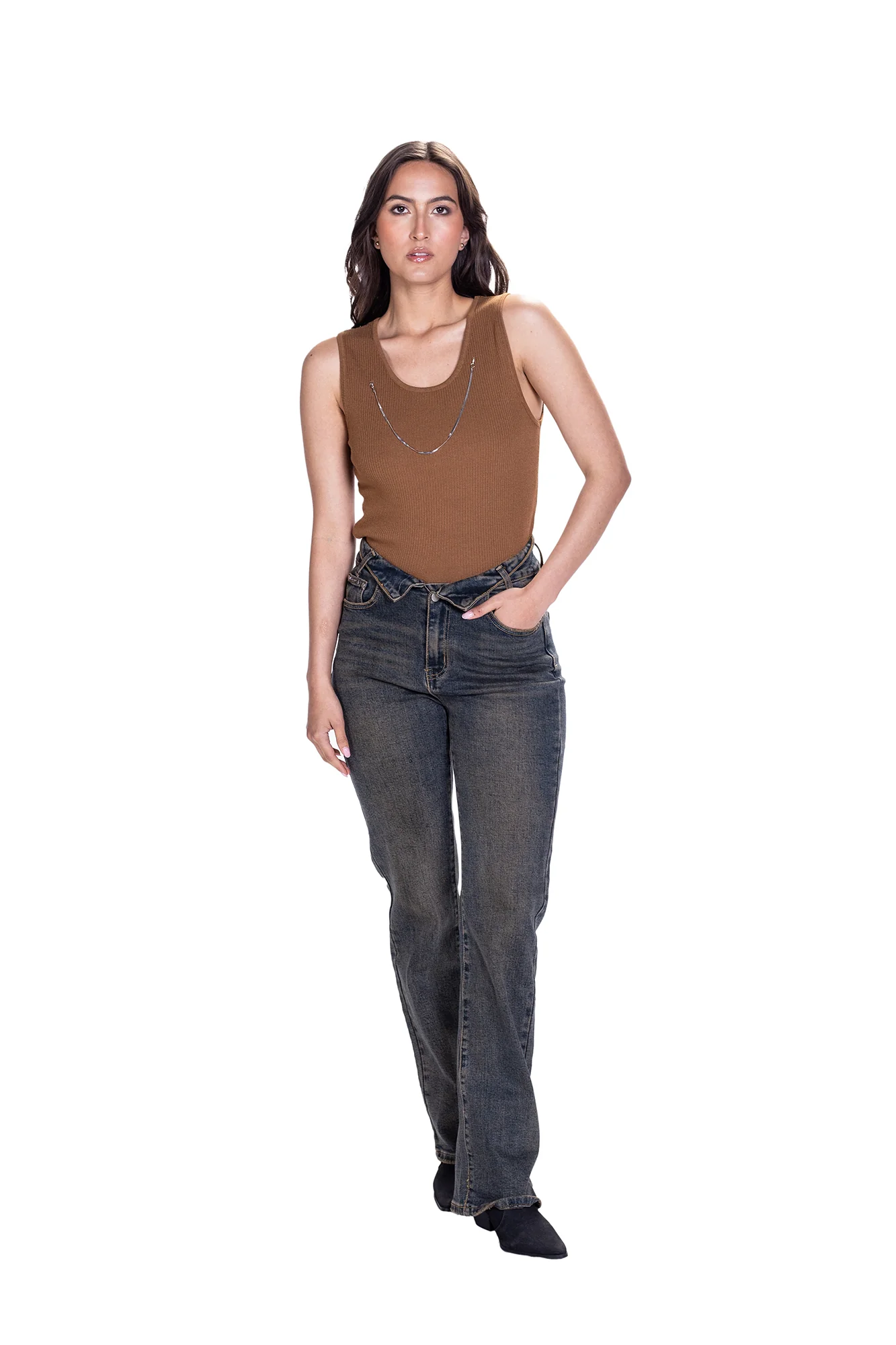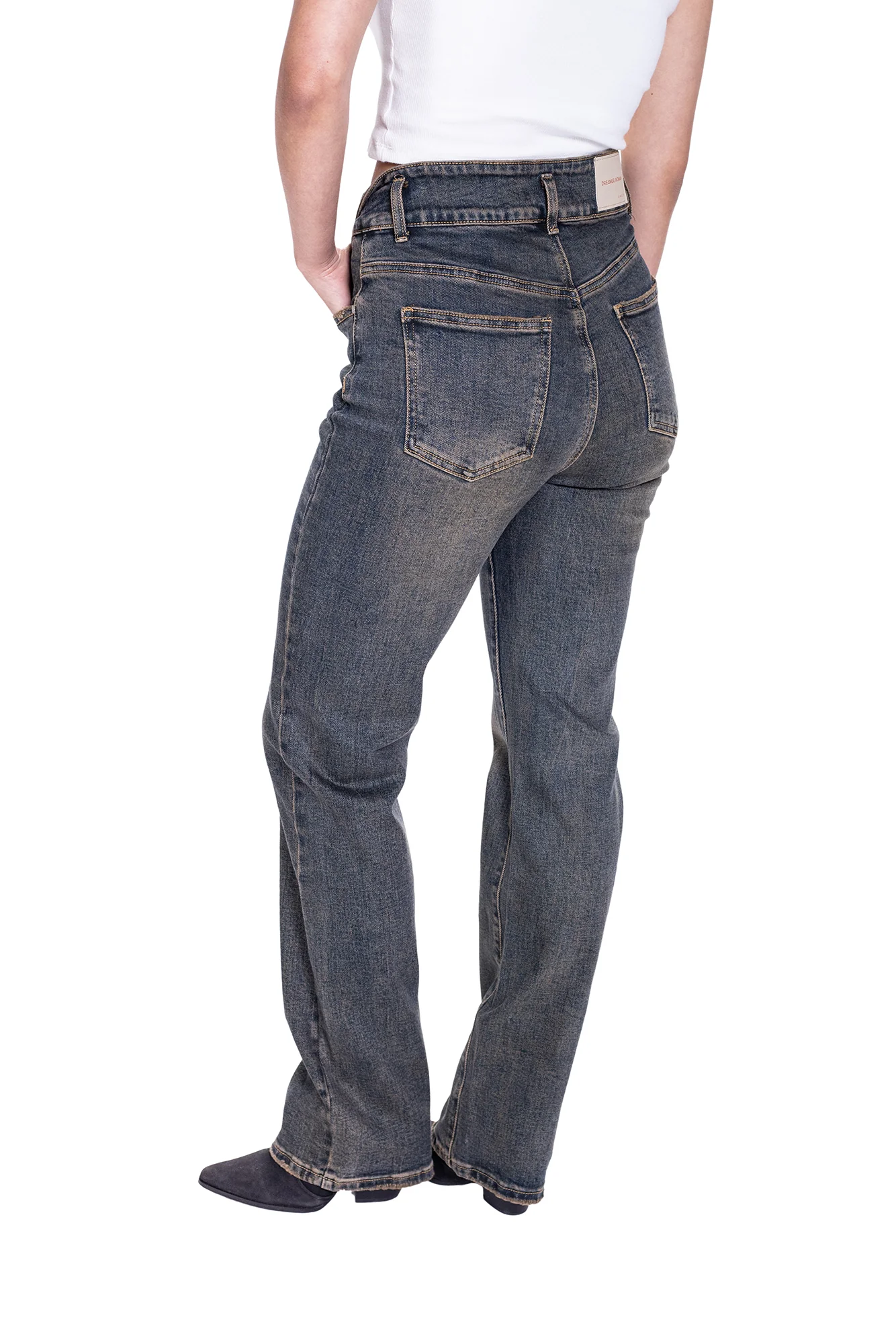 Jeans STRAIGHT ajustado en la cintura, corte recto y suelto en pierna, confeccionado con tejido elástico.