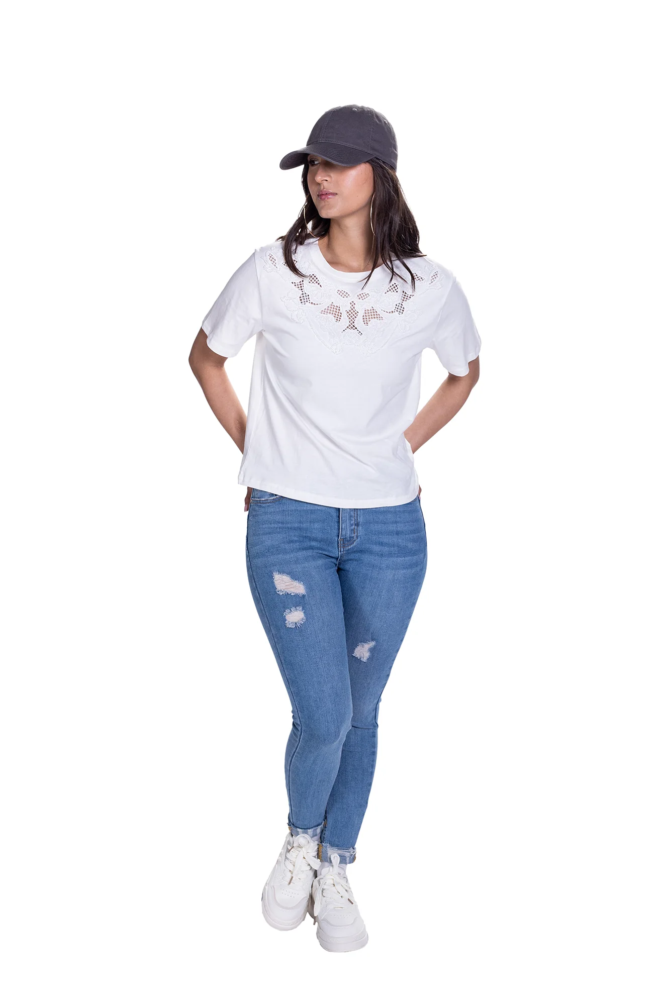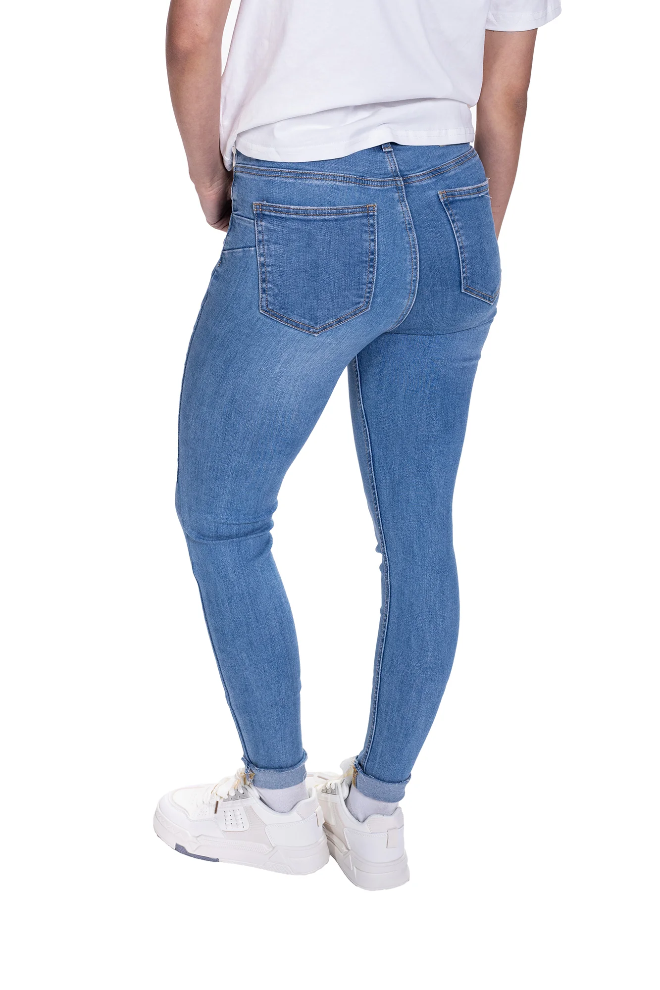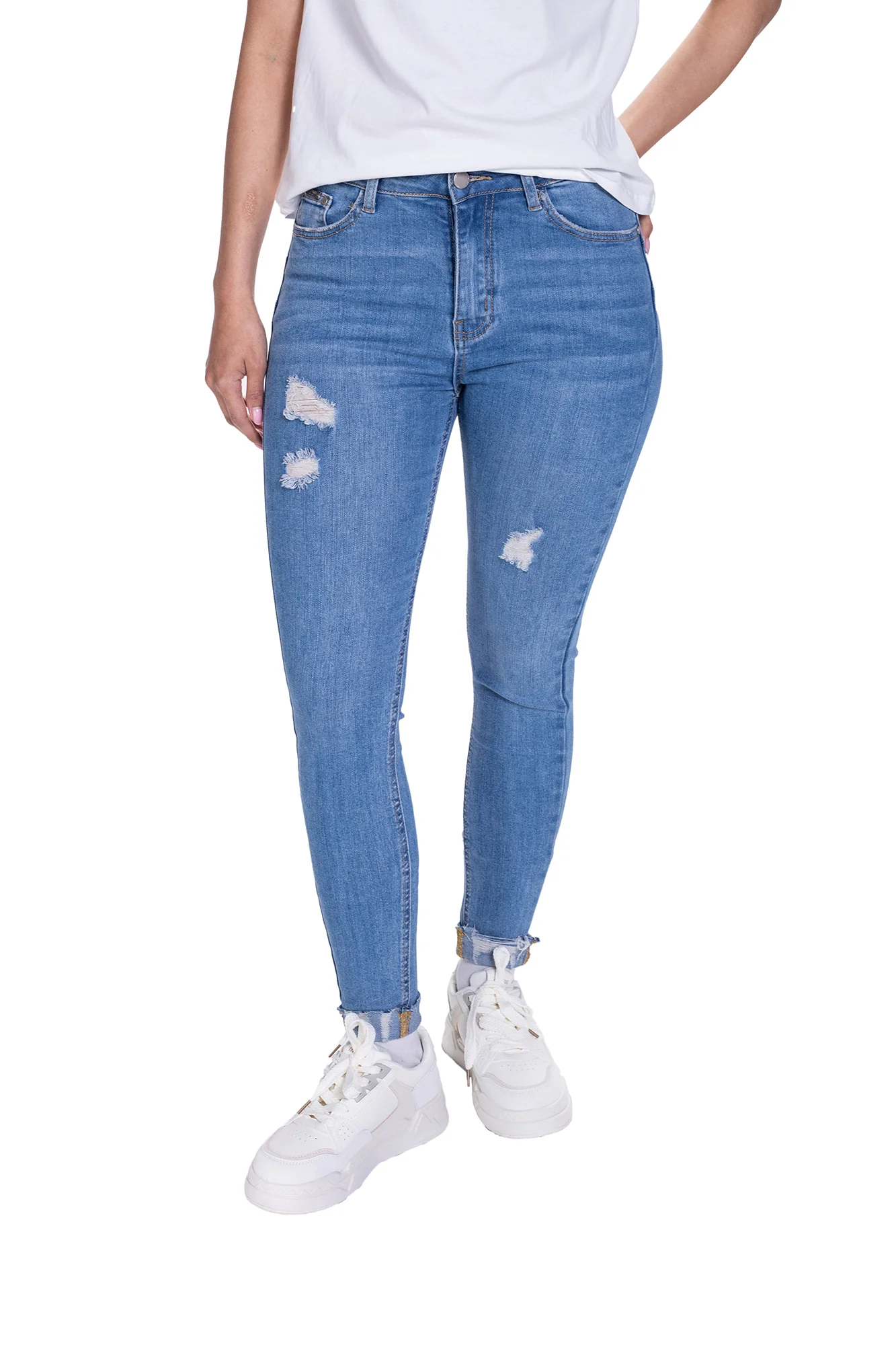 Jeans Mid Rise (tiro medio), tipo de cierre en cremallera y botón, confeccionado con tejido elástico.