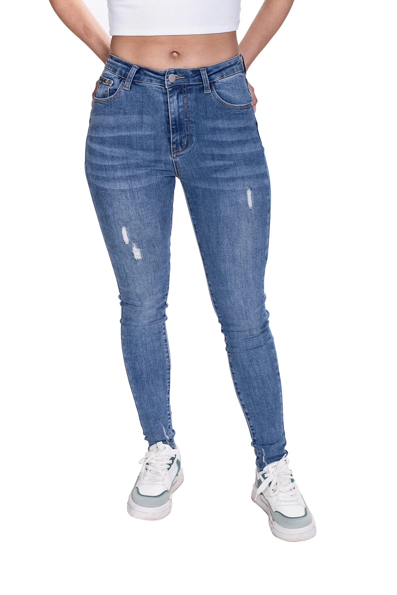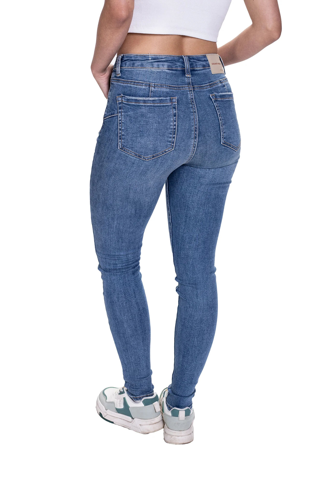 Jeans Mid Rise (tiro medio), tipo de cierre en cremallera y botón, confeccionado con tejido elástico.