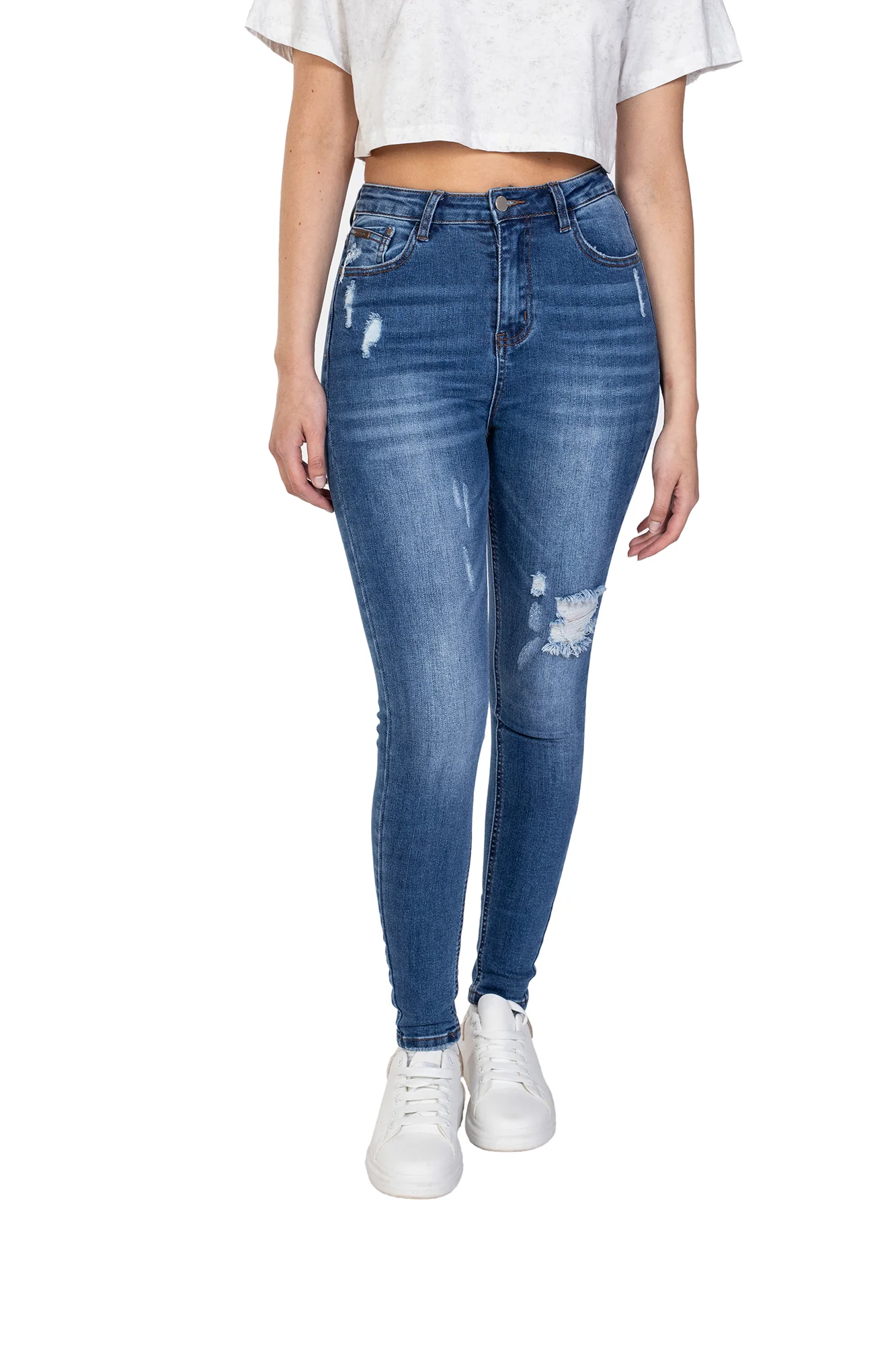 Jeans Mid Rise (tiro medio), tipo de cierre en cremallera y botón, confeccionado con tejido elástico.