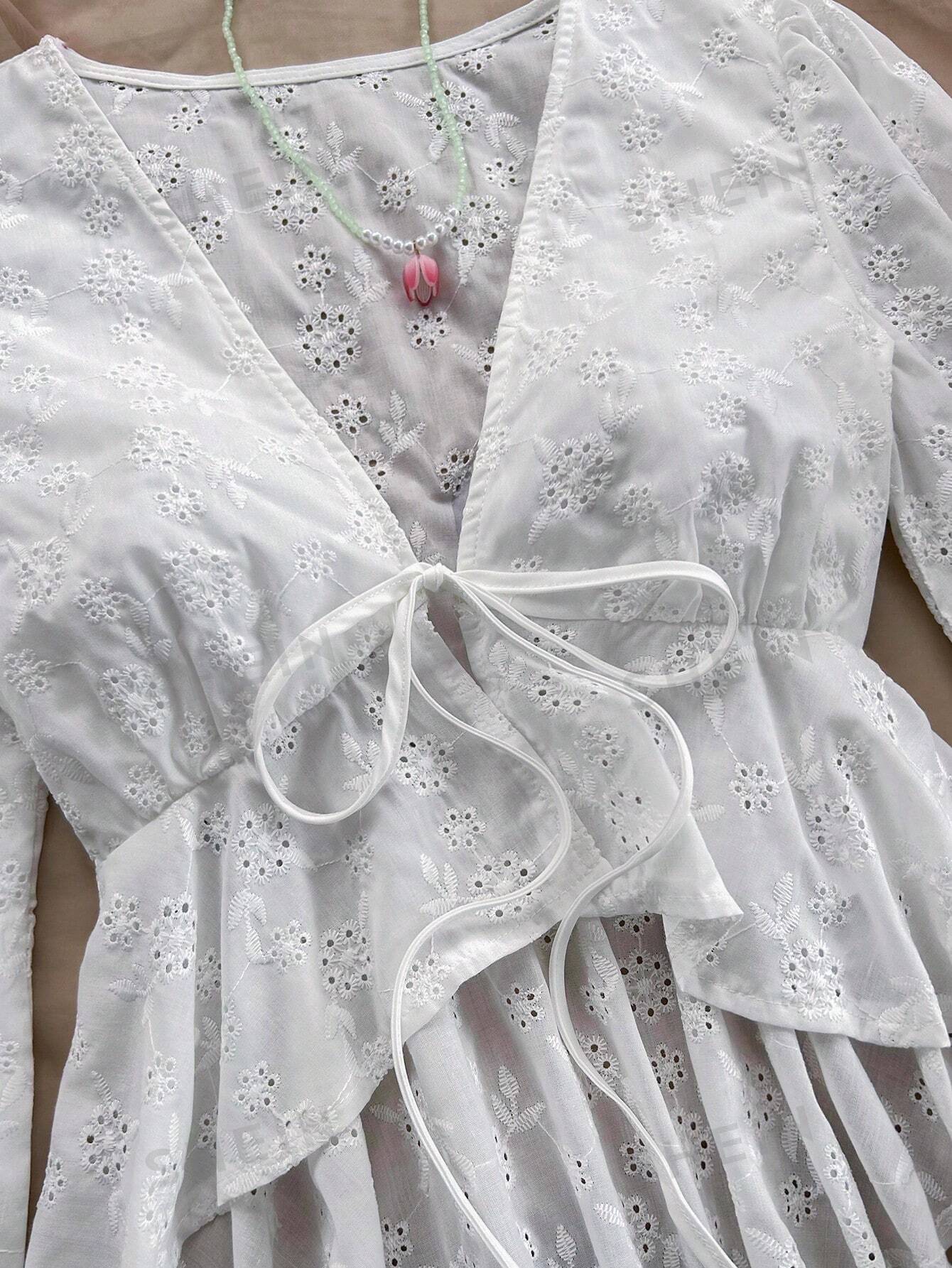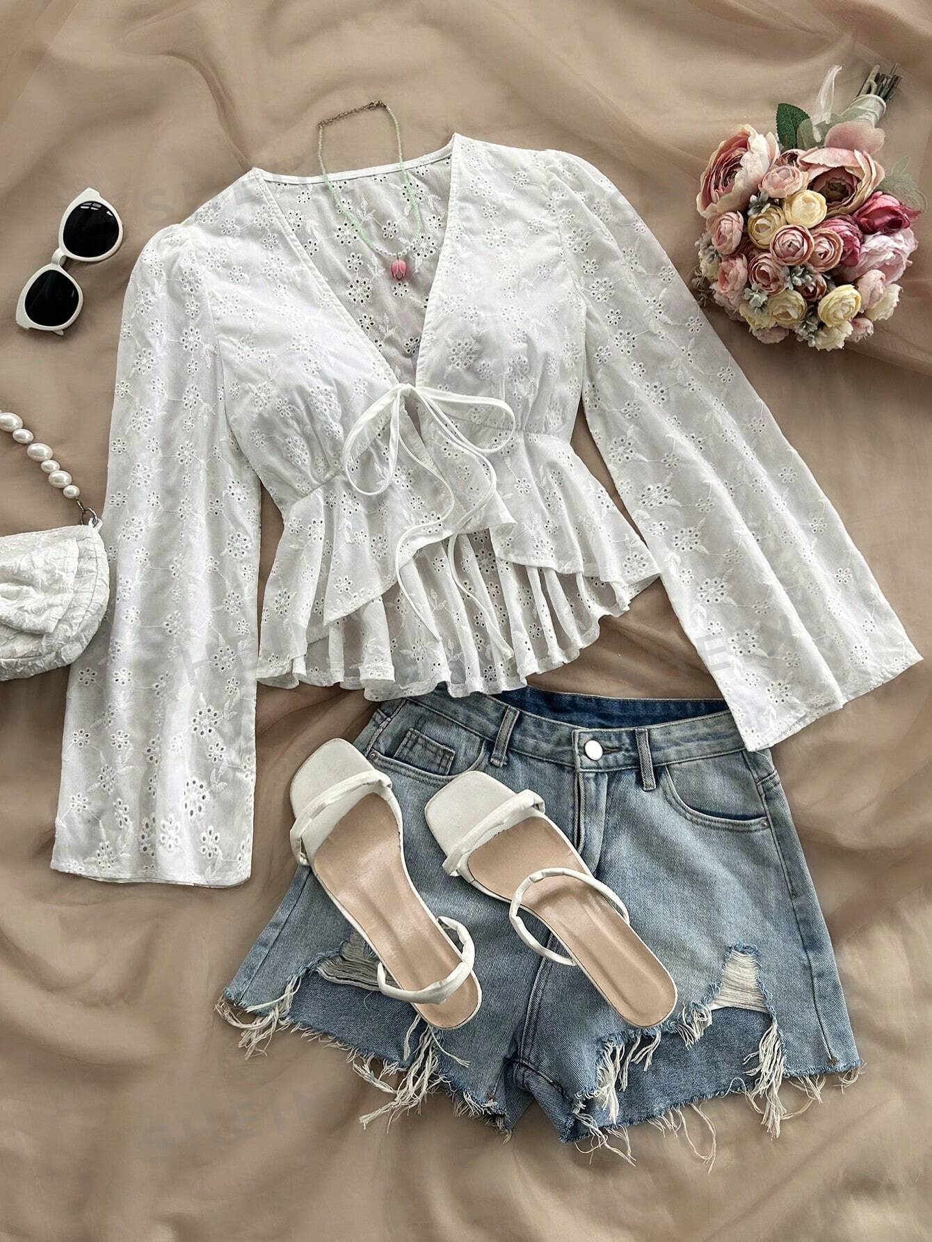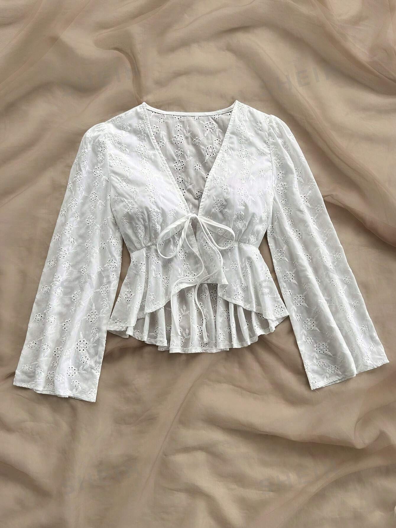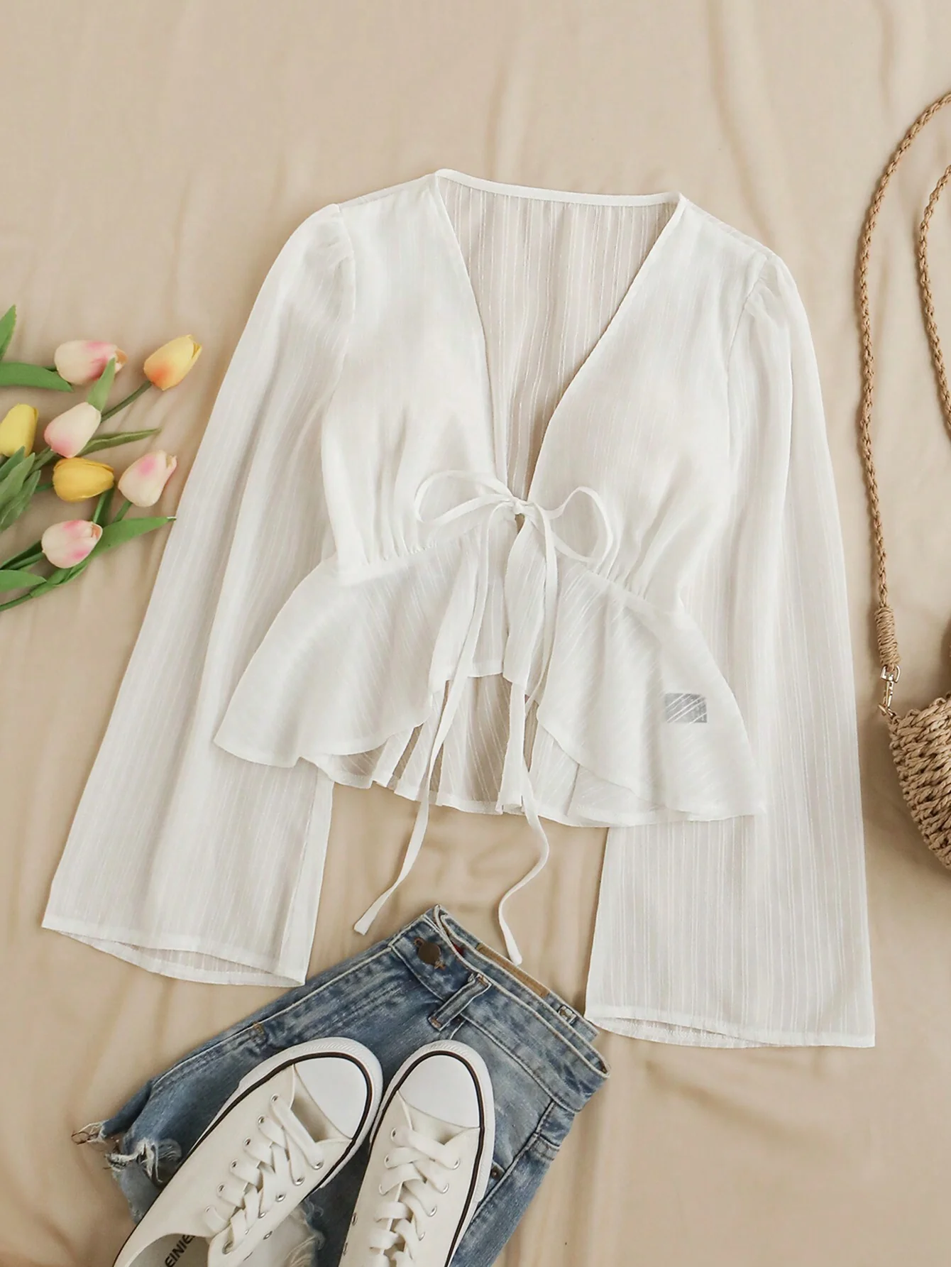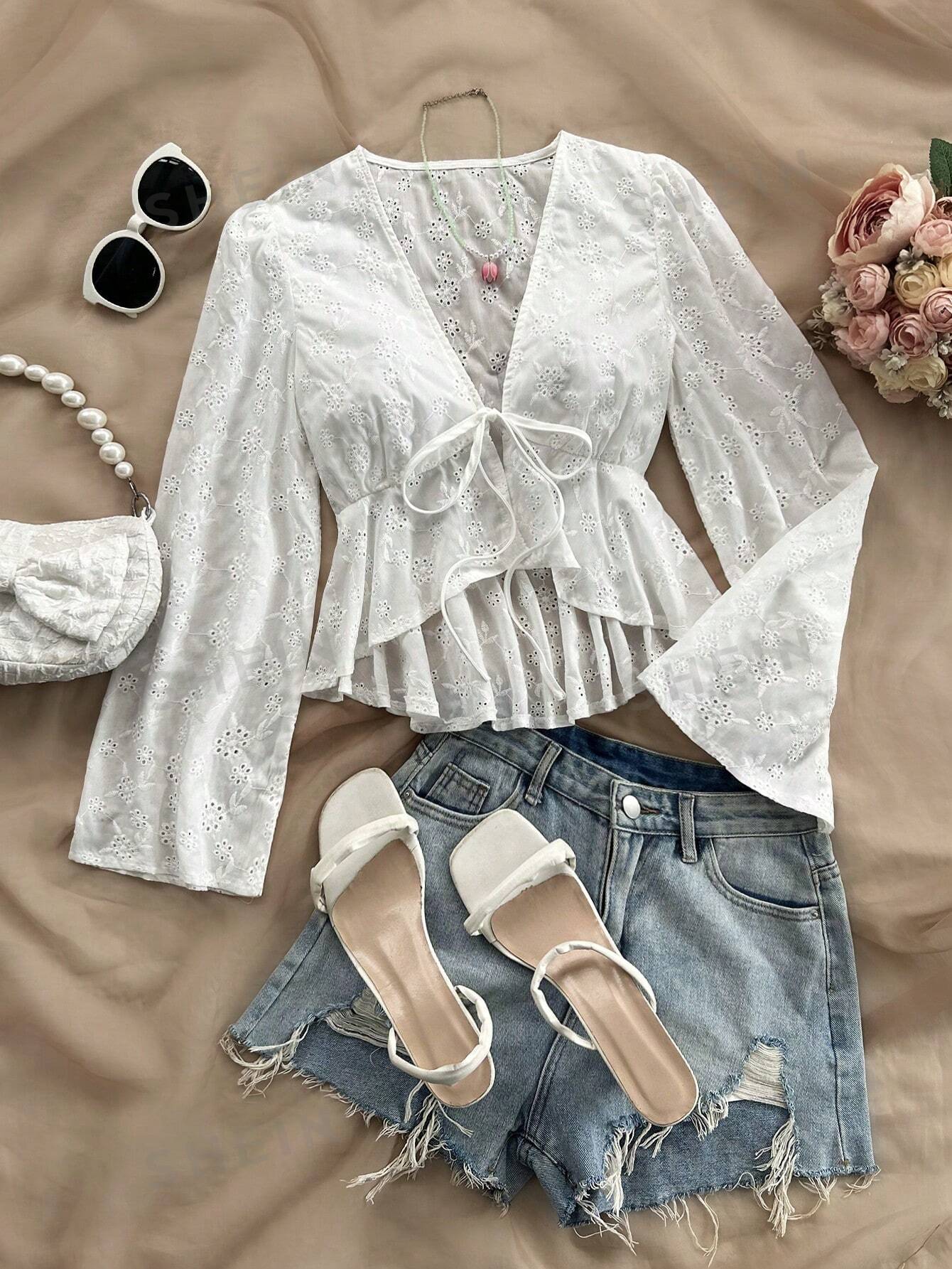 M00017 Camisa de ocio para mujeres de vacaciones, festival de música, con correa delantera en el pecho, mangas acampanadas con borde en forma de hoja de loto y panel con textura de encaje