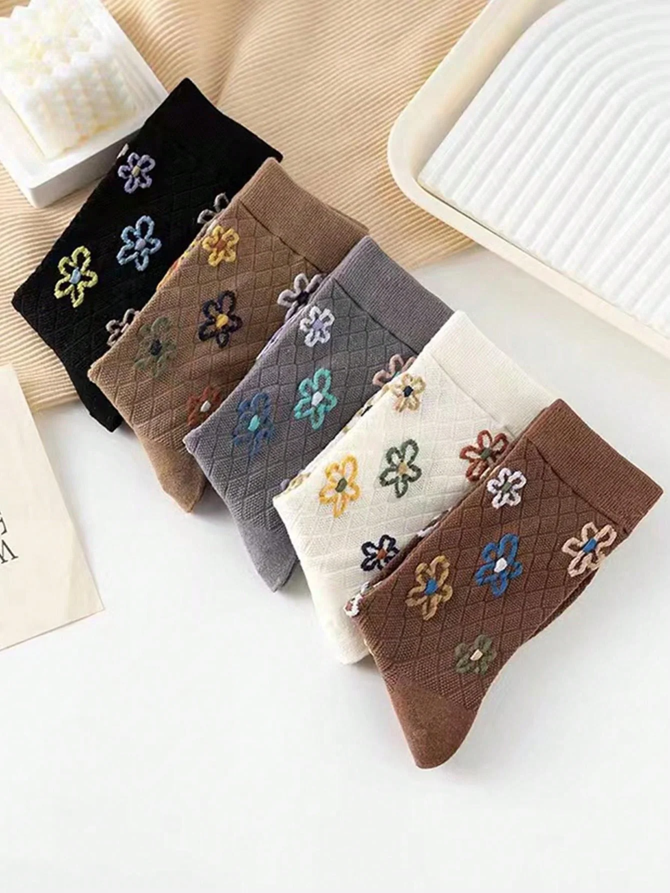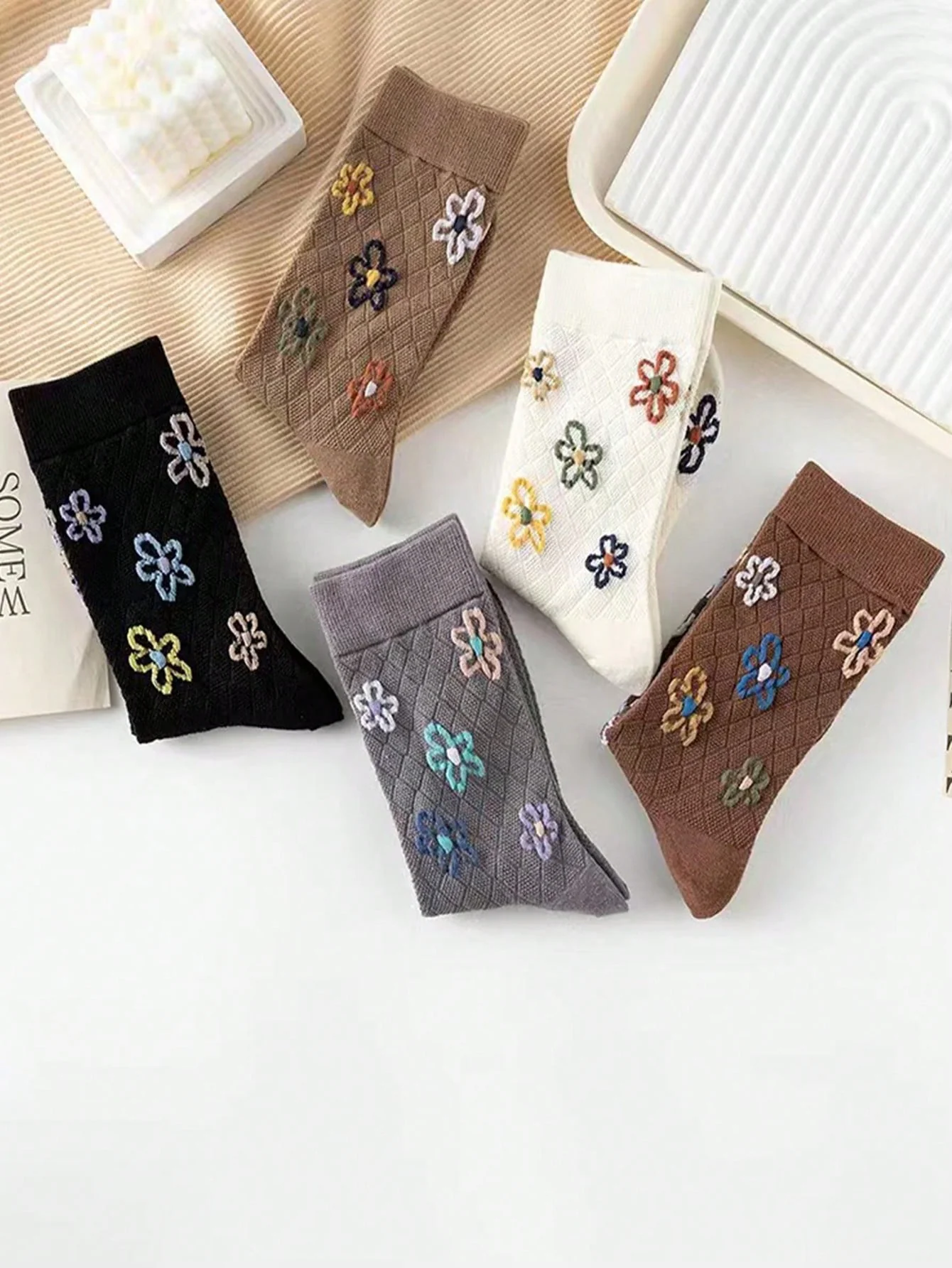 M00033 5 pares/paquete Calcetines de tubo altos bordados de flores vintage con patrones mixtos, calcetines de moda jacquard estilo coreano para mujeres