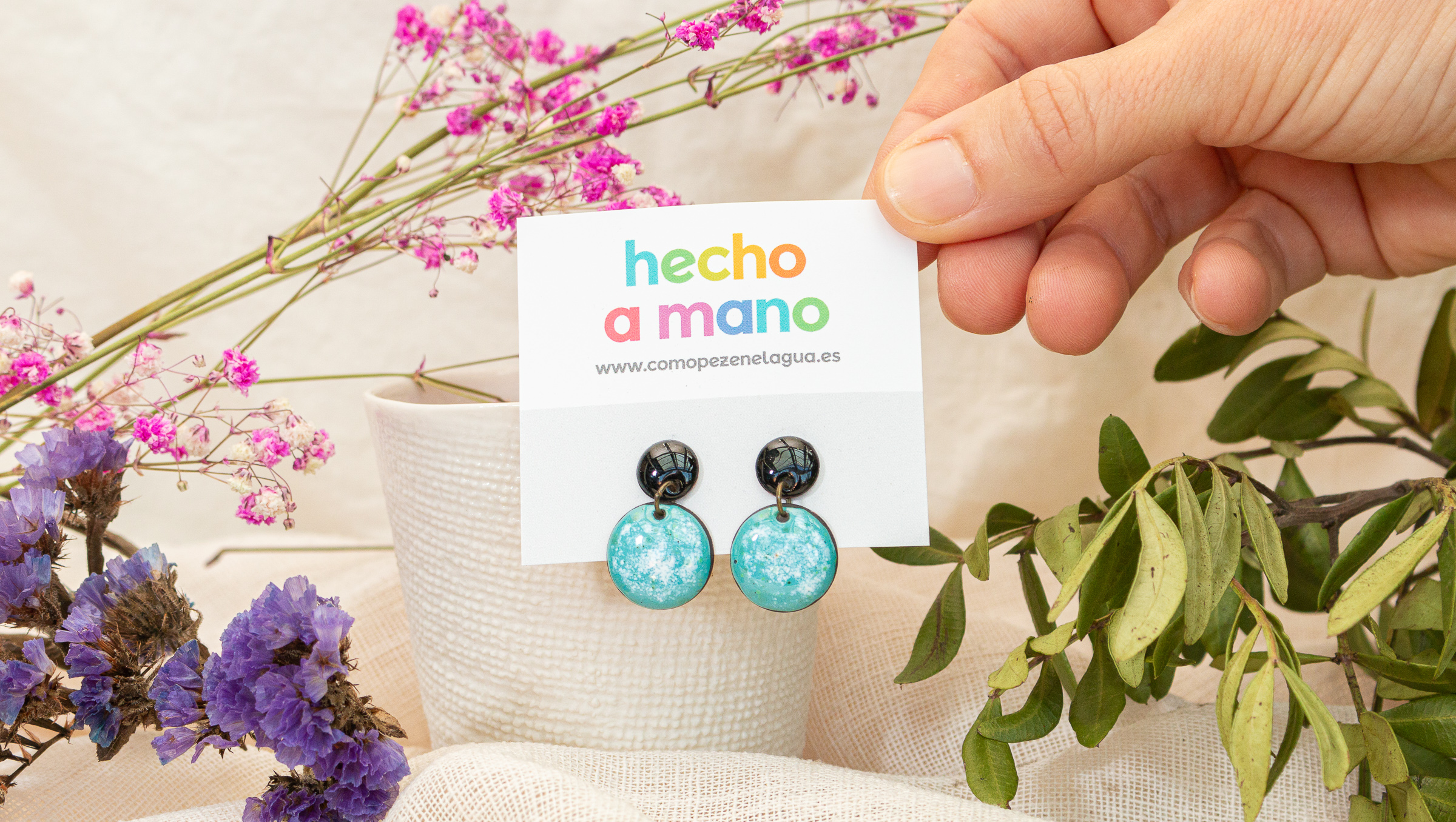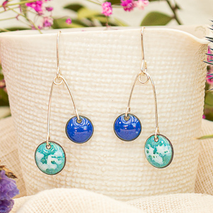 Estos pendientes están formados por dos discos de cobre esmaltados con distintos colores unidos por una argolla. El disco pequeño tiene un enganche de plata de pendiente y te quedará muy pegadito a la oreja.