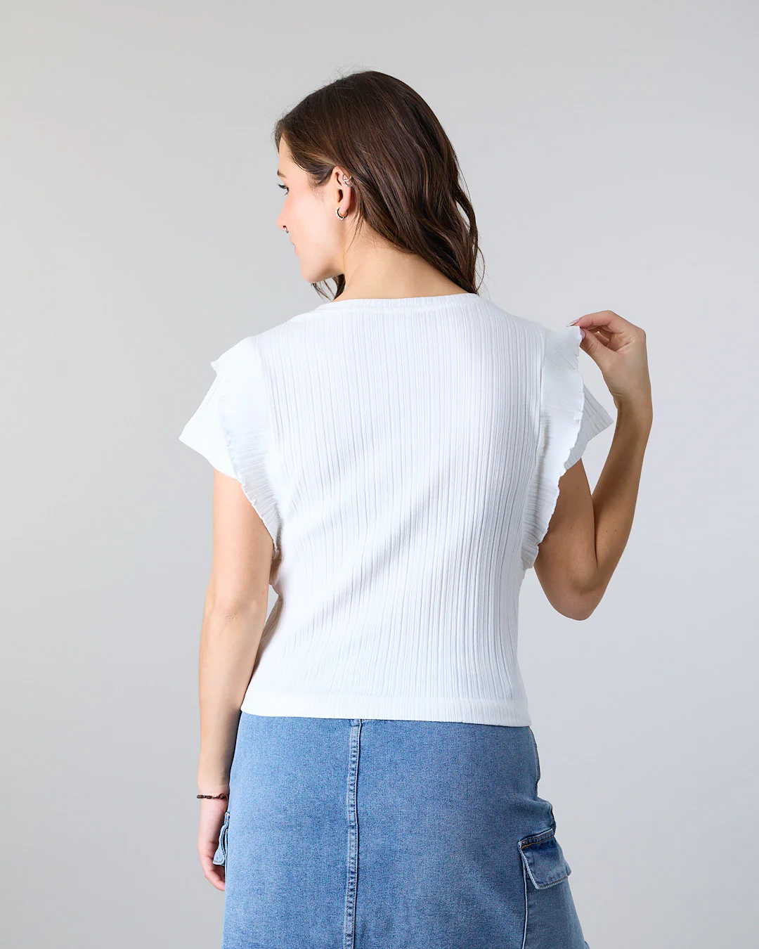 Polera mujer ideal para disfrutar este verano con un estilo slow fashion, fabricada con materiales de alta calidad y un enfoque en la durabilidad. Esta polera en color sólido y manga con vuelos se convierte en un básico de tu oufit
