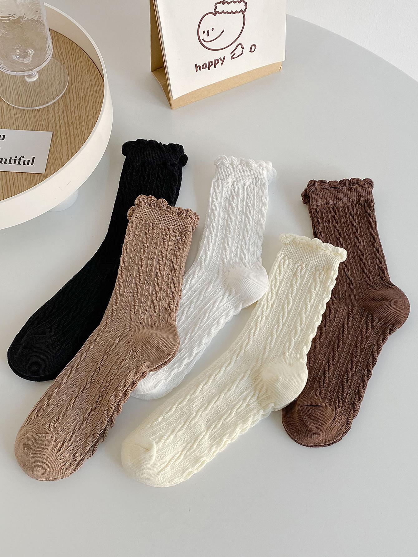 ST 0800 – 5 Pares De Calcetines De Media Pantorrilla Para Mujer, De Moda Y Versátiles, Con Encaje, Diseño Sencillo Para Uso Diario